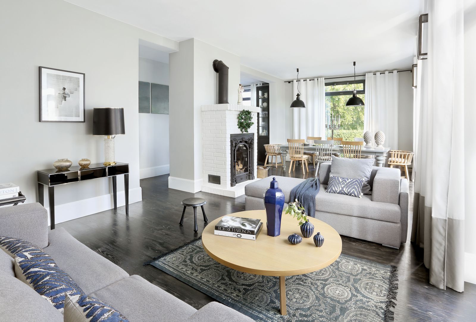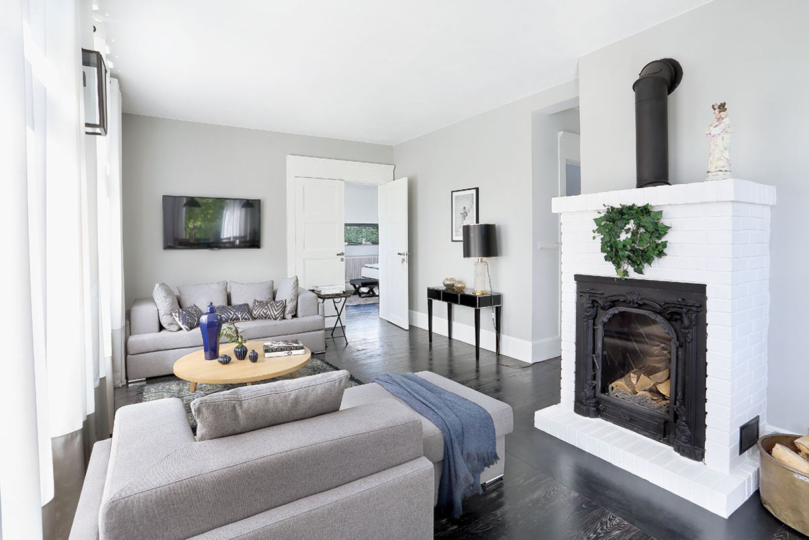 Salon z pięknie usłojoną dębową podłogą, pomalowaną na grafitowoczarny kolor, to dzieło lokalnych rzemieślników. Choreografię kanap w salonie Kasia bierze na siebie. Są megawygodne, składają się z modułów, które można dowolnie przestawiać w zależności od potrzeb. Dzięki nim salon wciąż się zmienia, jeden mebel, a tyle możliwości.