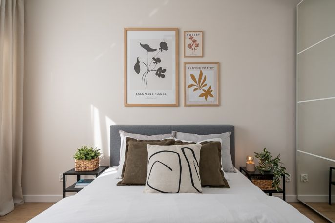 Wystrój sypialni jest w wersji „basic”. Wnętrze urządzono tak, by każdy, kto wynajmie mieszkanie, mógł je w prosty sposób spersonalizować. W zależności od potrzeb lokatorów znajdzie się tu miejsce na małe biurko czy dodatkową komodę.
