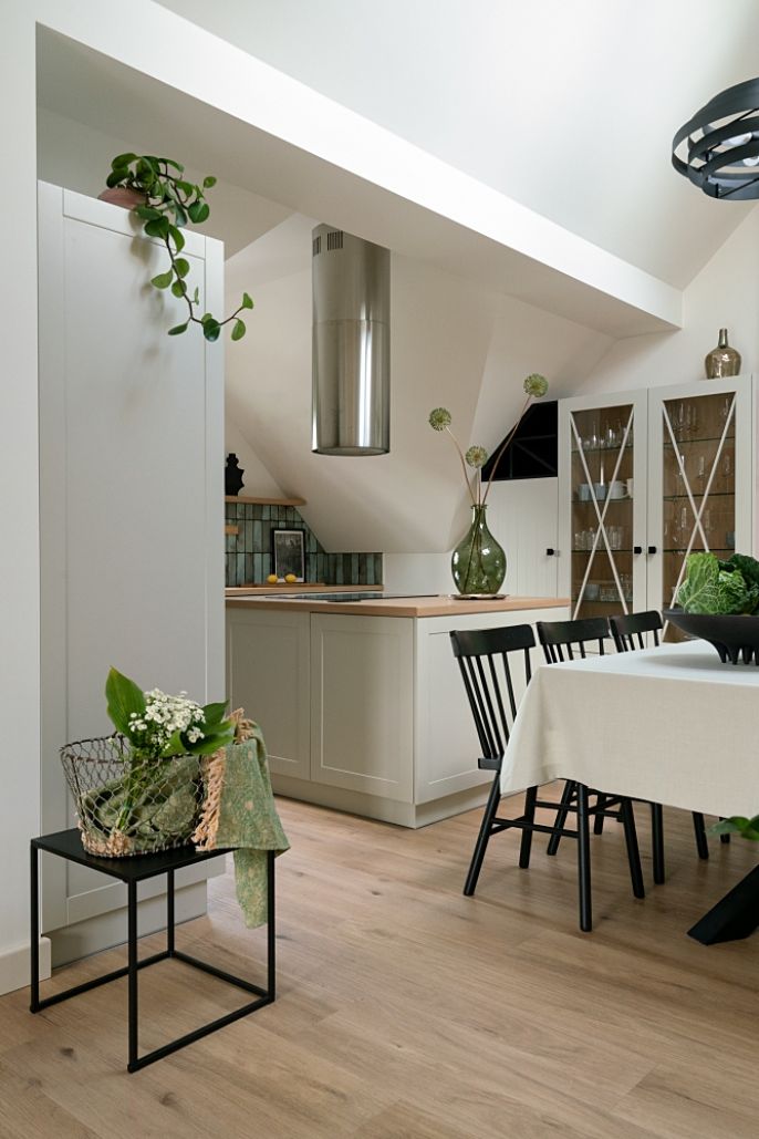 Wygodna strefa dzienna i funkcjonalna kuchnia na poddaszu ze skosem