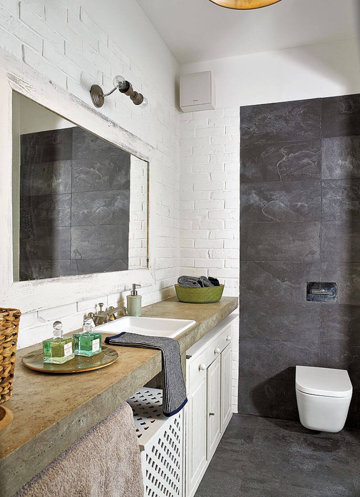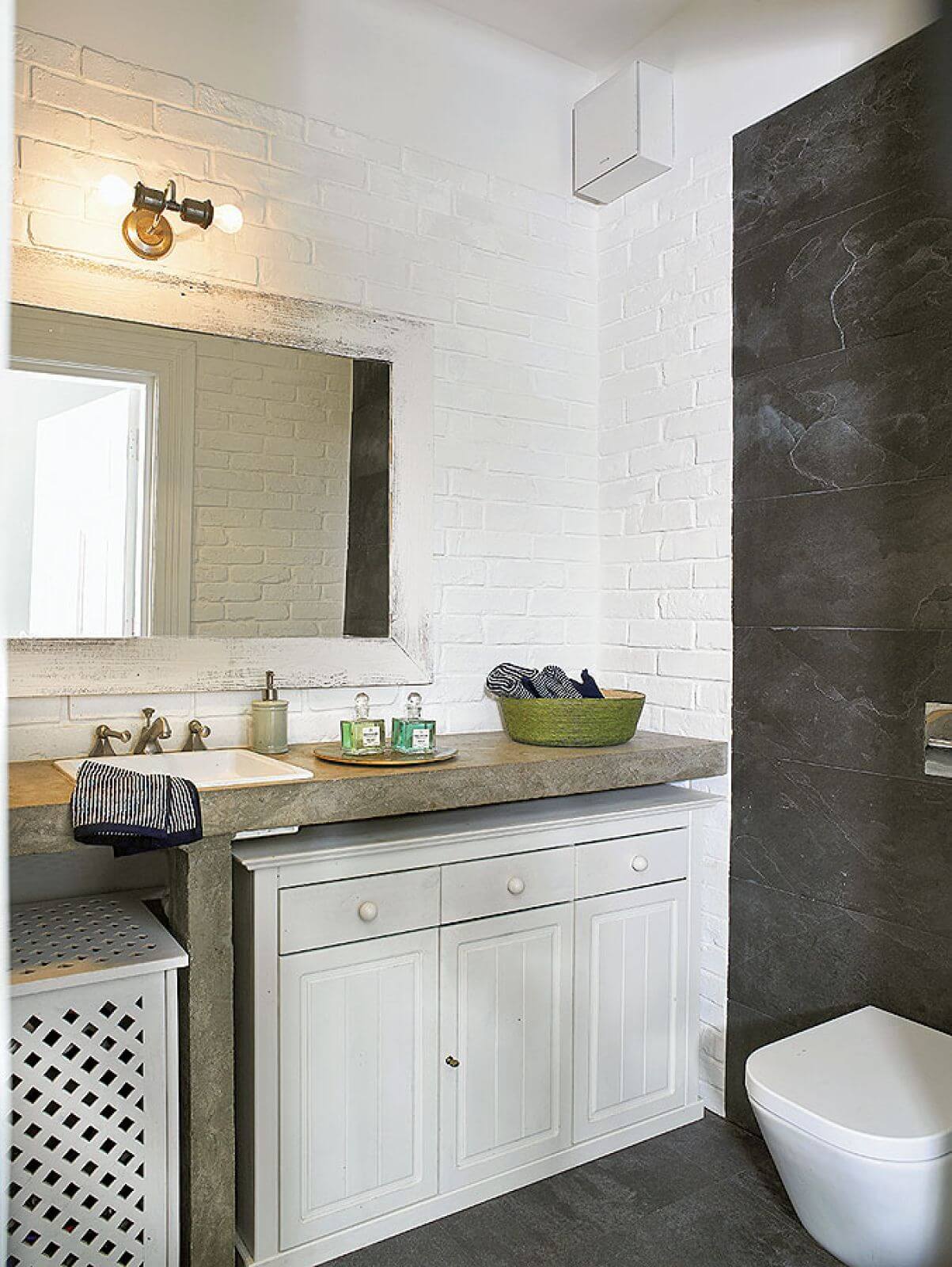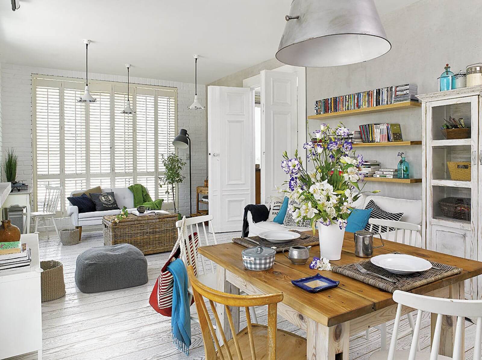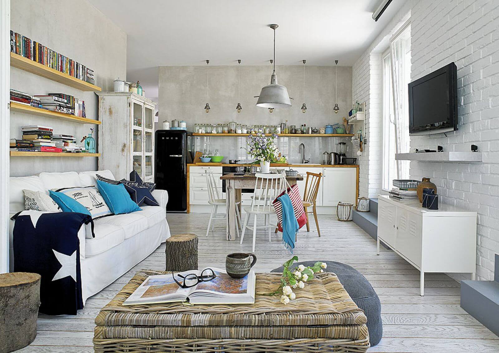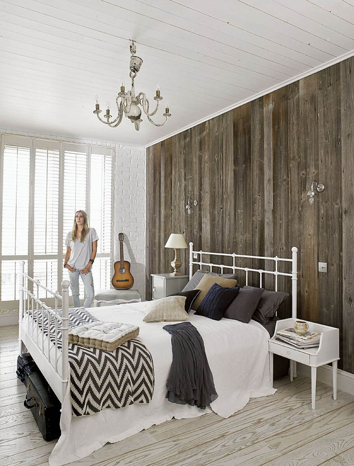 Bielone dechy na podłodze, cegła rozbiórkowa na ścianie