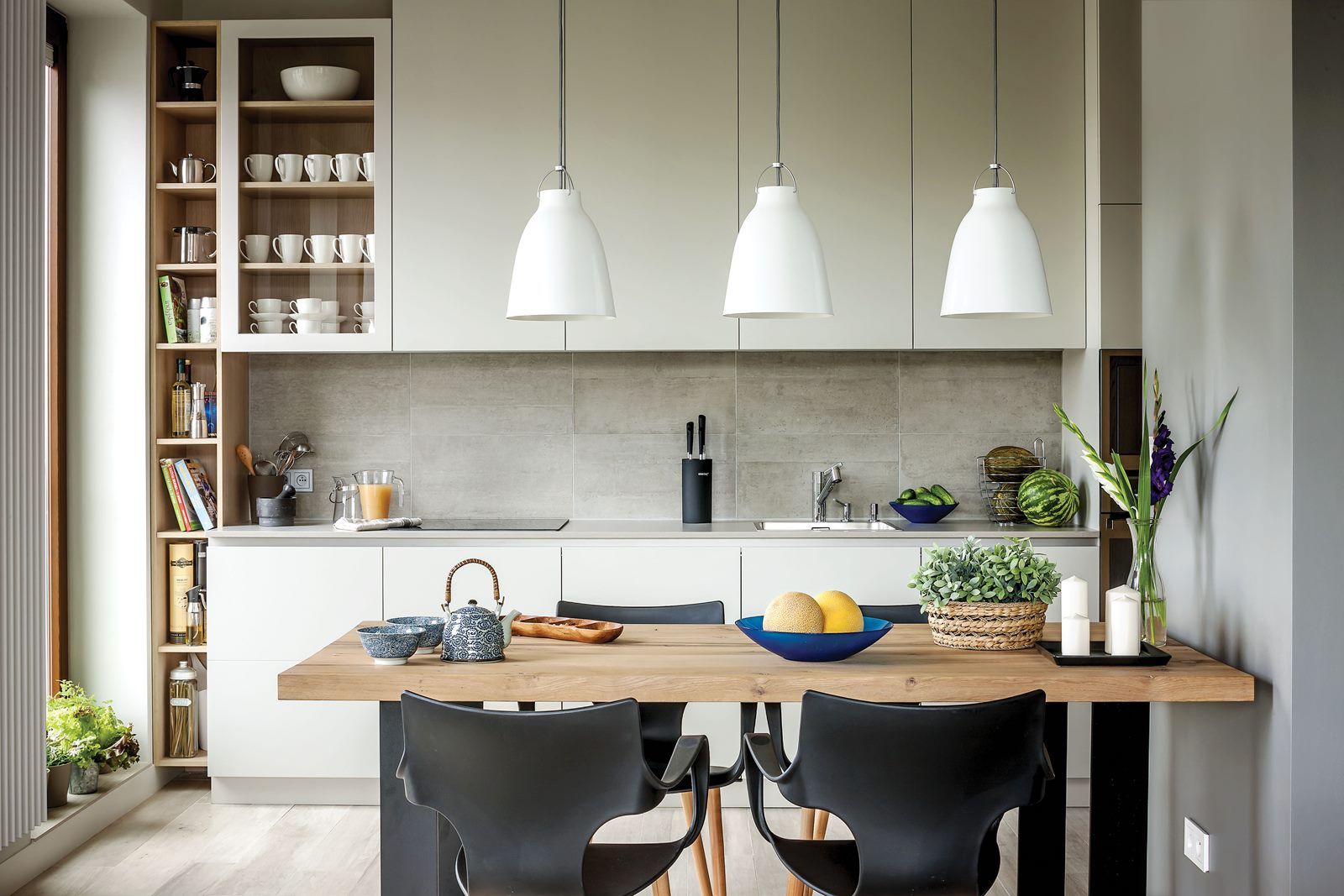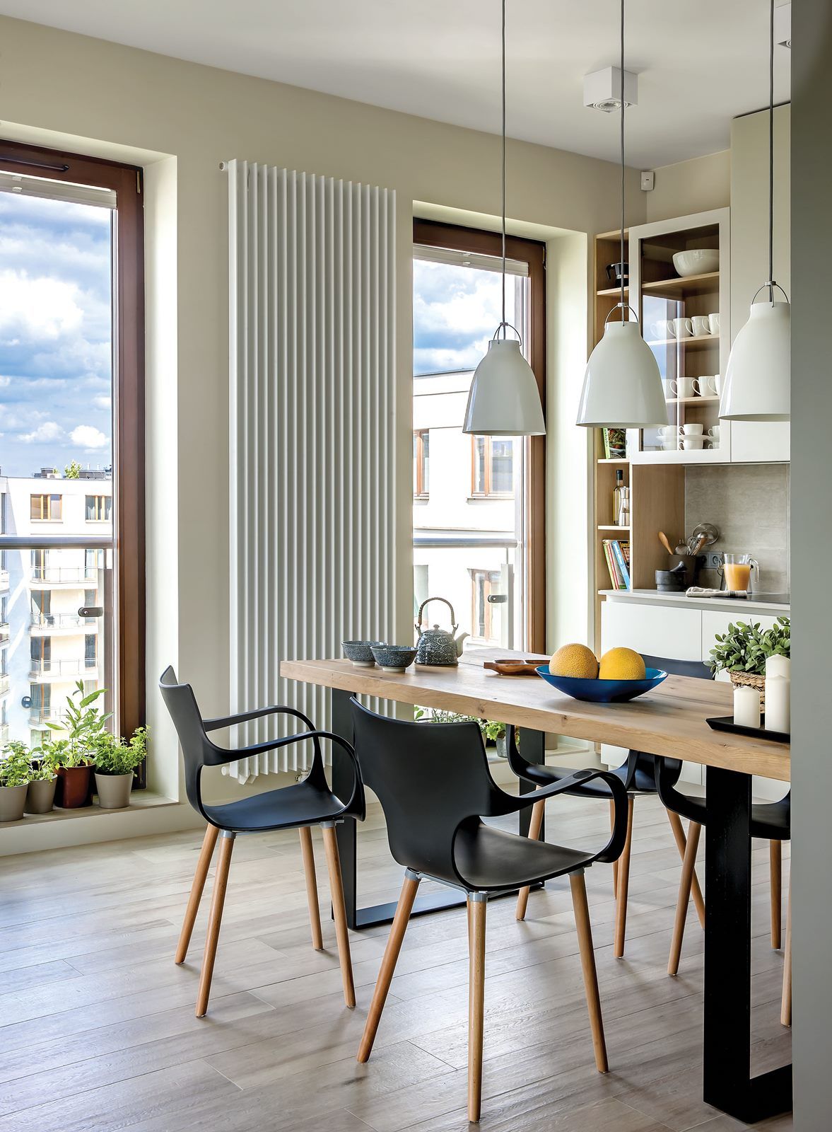 Jeśli czegoś nie dało się usunąć, a tak było ze słupem konstrukcyjnym pośrodku apartamentu, Magda i Jacek postarali się, by ten element wydawał się rzeczą dla wnętrza niezbędną. – Teraz obudowany słup niczym Światowid patrzy na cztery strony świata – opowiadają. – Jest jednocześnie szafą w kuchni, biblioteczką w salonie, miejscem na obrazy w holu i wsparciem dla stołu w jadalni.