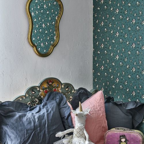ONA: Stoliczek przy łóżku – też znaleziony – został przygarnięty ze względu na dziwność. Stoi na jelenich rogach i ma blat z tłoczonej blachy, nie jest w naszym stylu, ale ma w sobie coś. Bo my nie lubimy nudy. Walczymy z nią każdym przygarniętym przedmiotem. Dziś mebel stoi na tej ścianie, jutro może być gdzie indziej. Obrazek dziś zdobi łazienkę, a jutro salon. Czasem Rysio wraca z pracy i nie poznaje mieszkania. To tak, jakbyśmy każdego dnia odkrywali nowe miejsca i nowe przestrzenie!