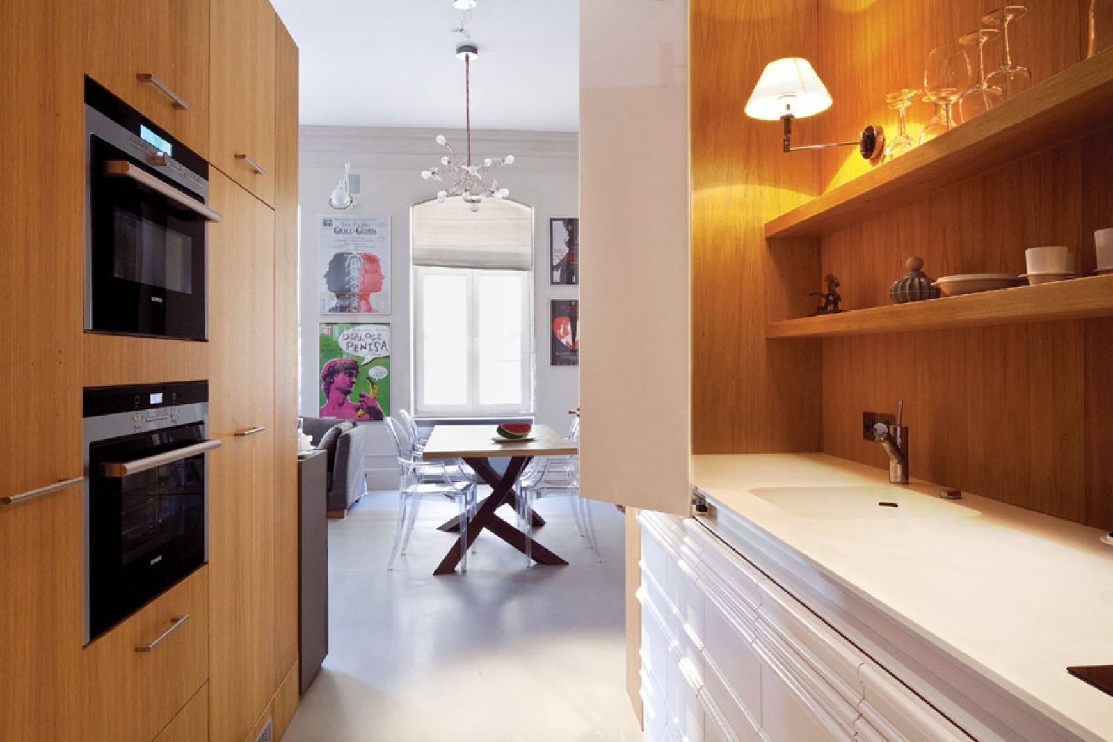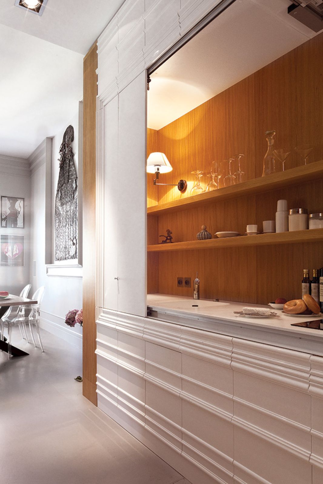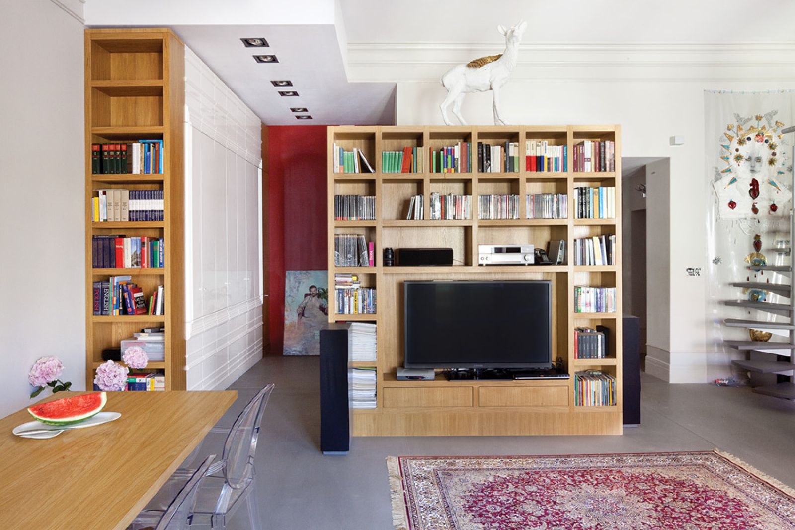 Joanna: – Taki klient to marzenie. Po pierwsze, jeden człowiek na prawie 90 metrach. Po drugie, pokazałam kilka pomysłów, a on bez wahania wybrał najbardziej odważny. Ściany poszły więc w ruch. Przed rewolucją mieszkanie składało się z ośmiu pomieszczeń, sztucznie stworzonych po wojnie. Pozmienialiśmy wszystko. Księgozbiór miał zająć antresolę, ale szybko przestał się mieścić.