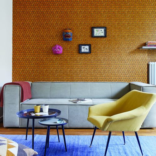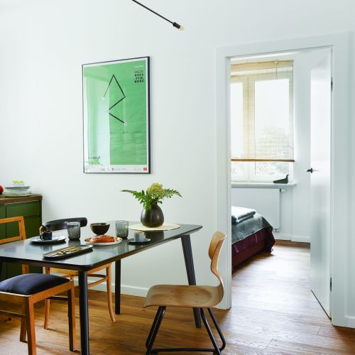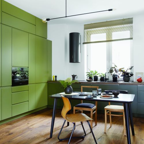 W zabudowie kuchni rządzi zieleń – barwa nadziei – i to w dwóch odcieniach, żeby nie było zwyczajnie. W salonie z jednej strony uwagę przykuwa kolorowy regał, który jest niczym hołd złożony Le Corbusierowi, lekki, do szpiku kości modernistyczny, a na przeciwległej ścianie – egzotyczna w wyrazie tapeta wprowadzająca trochę kolonialnej aury. To pomysł, który narodził się w głowie Magdy po powrocie z Kambodży. Stamtąd przywiozła też barwne, ekspresyjne maski.