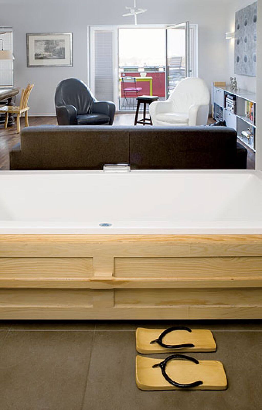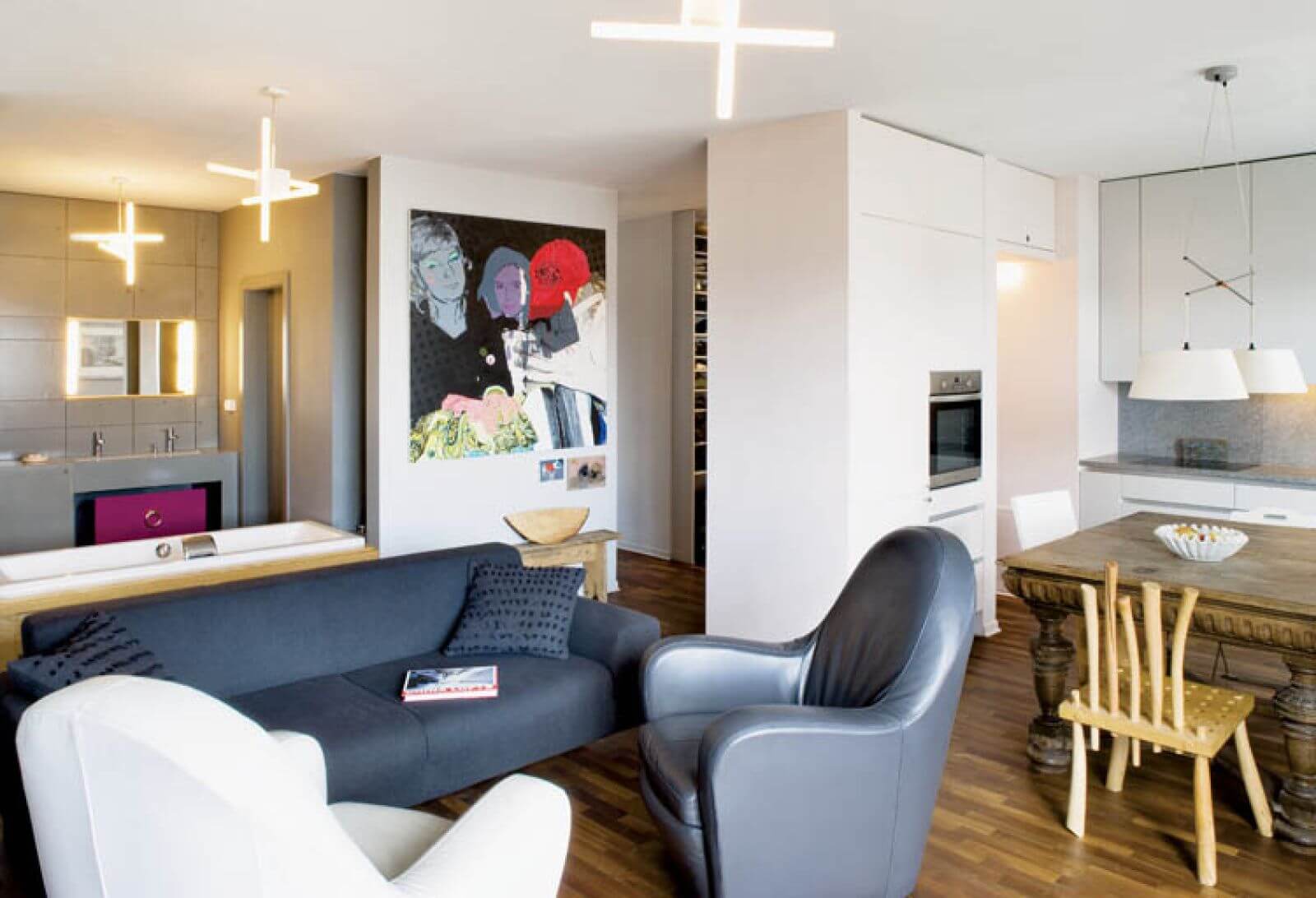We własnym mieszkaniu zrezygnowała z szaleństw. Może tylko łazienka otwarta na salon wzbudzała przez jakiś czas sensację. Wanna podczas imprez stawała się kanapą, a domownicy, biorąc kąpiel, oglądali telewizję. Jednak, gdy dwa lata temu na świat przyszedł Staszek, właściciele zasłonili ją przesuwanymi drzwiami, na których powiesili ulubiony obraz „Przyjaciele” Agnieszki Sandomierz. Na chłodnych, szarych ścianach świetnie wyglądają mocne kolory, ale użyte umiarkowanie.