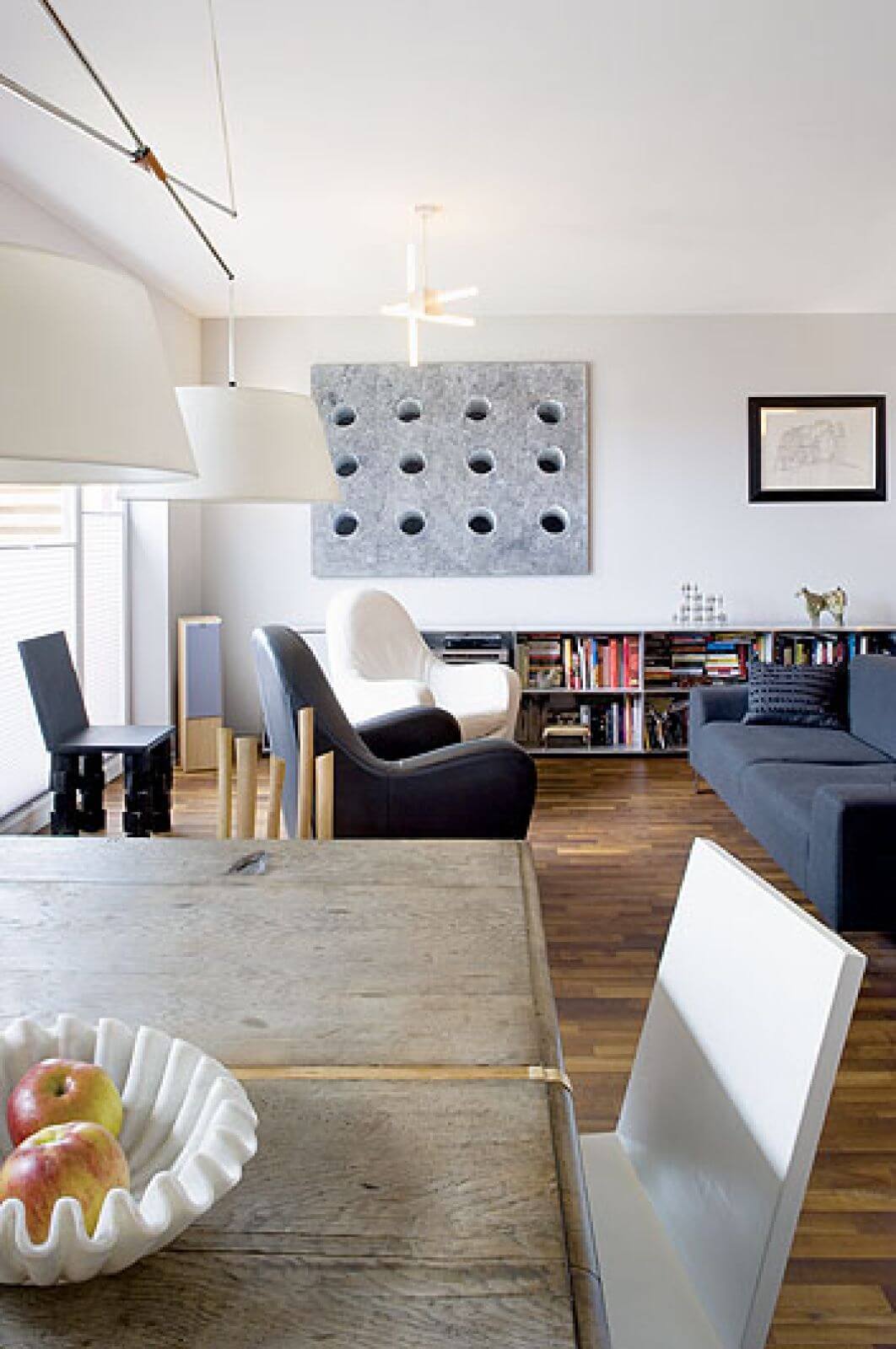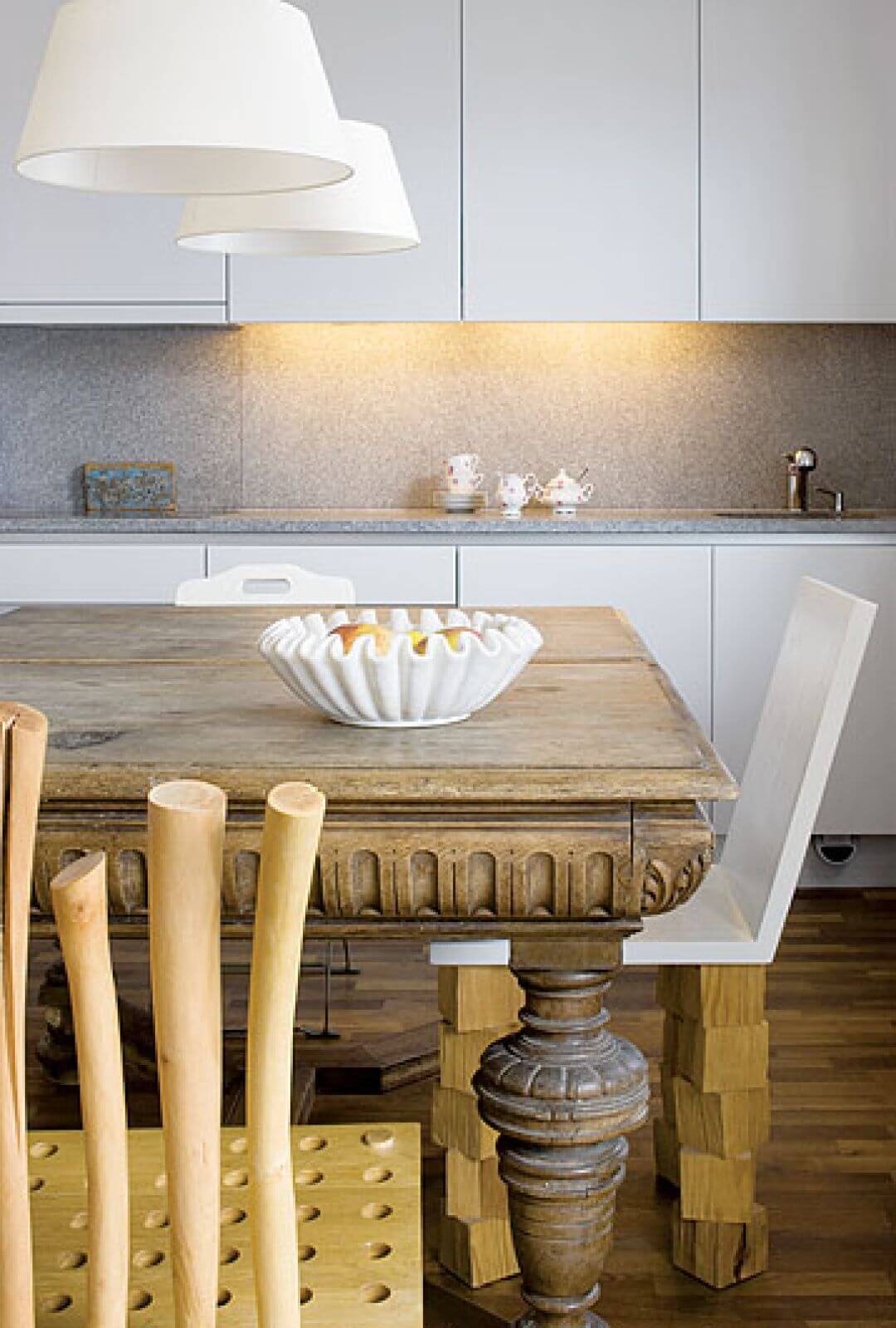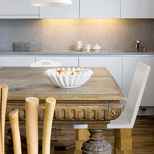 Uwagę zwracają zabawne krzesła: z dziurkowanym siedziskiem autorstwa Pawła Grunerta – to prezent od rodziców, te ze „zwichrowanymi” nogami zaprojektowała właścicielka. Najważniejszym meblem jest jednak wielki, solidny stół w kuchni, który Joanna i Piotrek wypatrzyli na bazarze w podwarszawskich Broniszach.