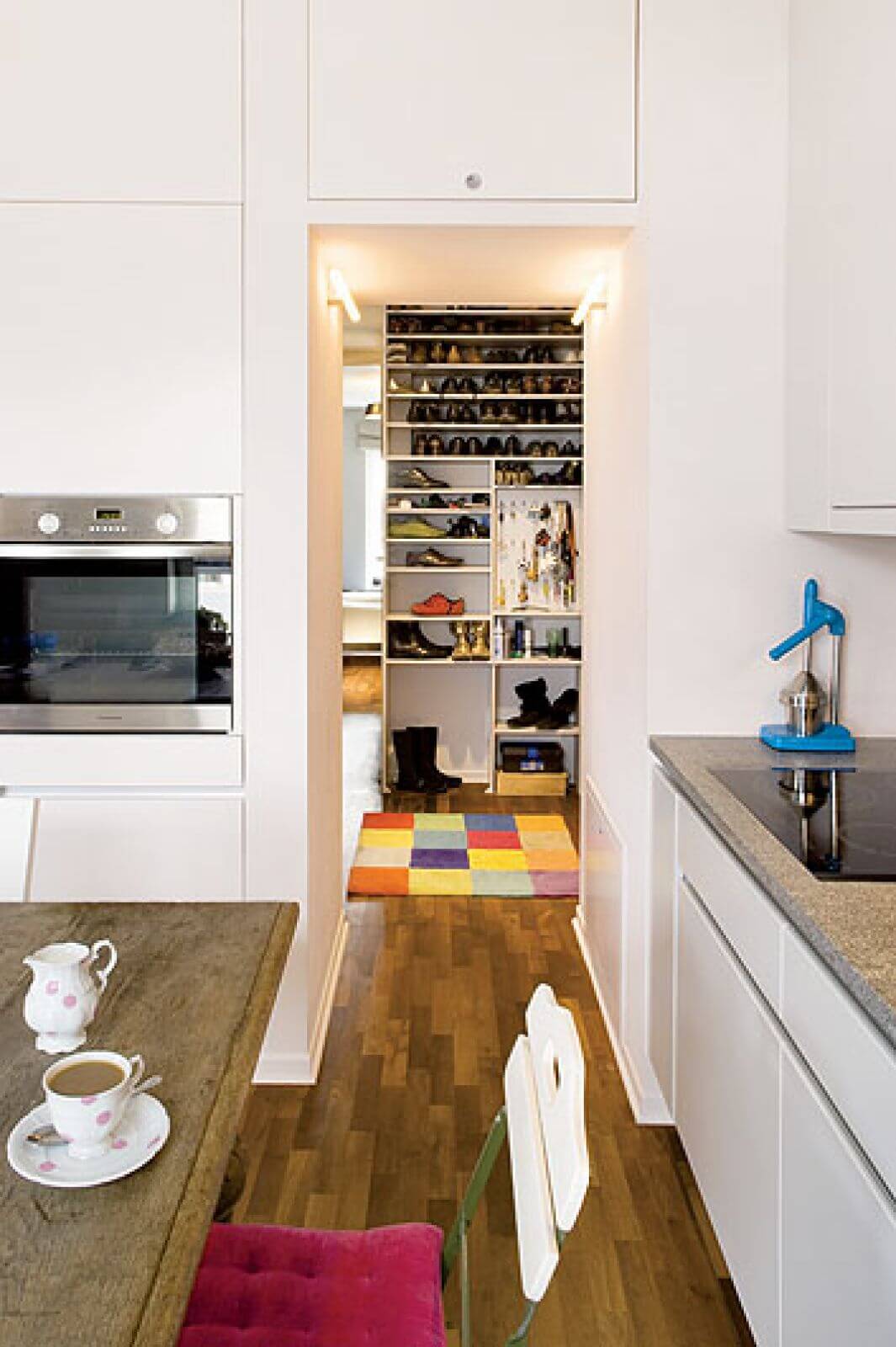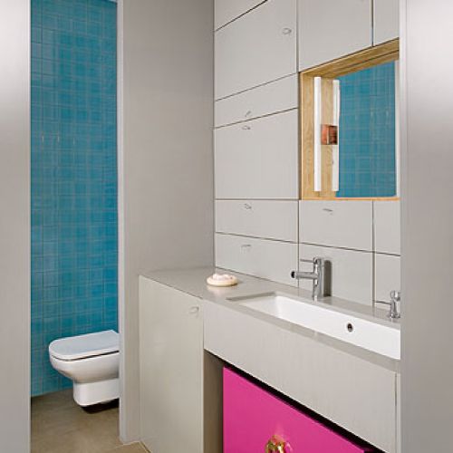 – Lubię szarość, ale wiem, że bywają dni, kiedy takie wnętrze wygląda smutno. Siła tkwi w pomyśle – Joanna wyjaśnia, skąd wzięły się turkusowe płytki pod prysznicem czy amarantowy pojemnik na pranie. – Wejście w taki wielki błękit daje dobrą energię – mówi. Przede wszystkim jednak w mieszkaniu rządzą ukochane przedmioty, których Joannie nigdy dość. – Jestem typem zbieracza, ciągle jeżdżę na rozmaite targi, a rzeczy się do mnie przyklejają. Nieustannie z tym walczę. W zależności od nastroju niektóre drobiazgi są na widoku, a inne siedzą w szafie – śmieje się.