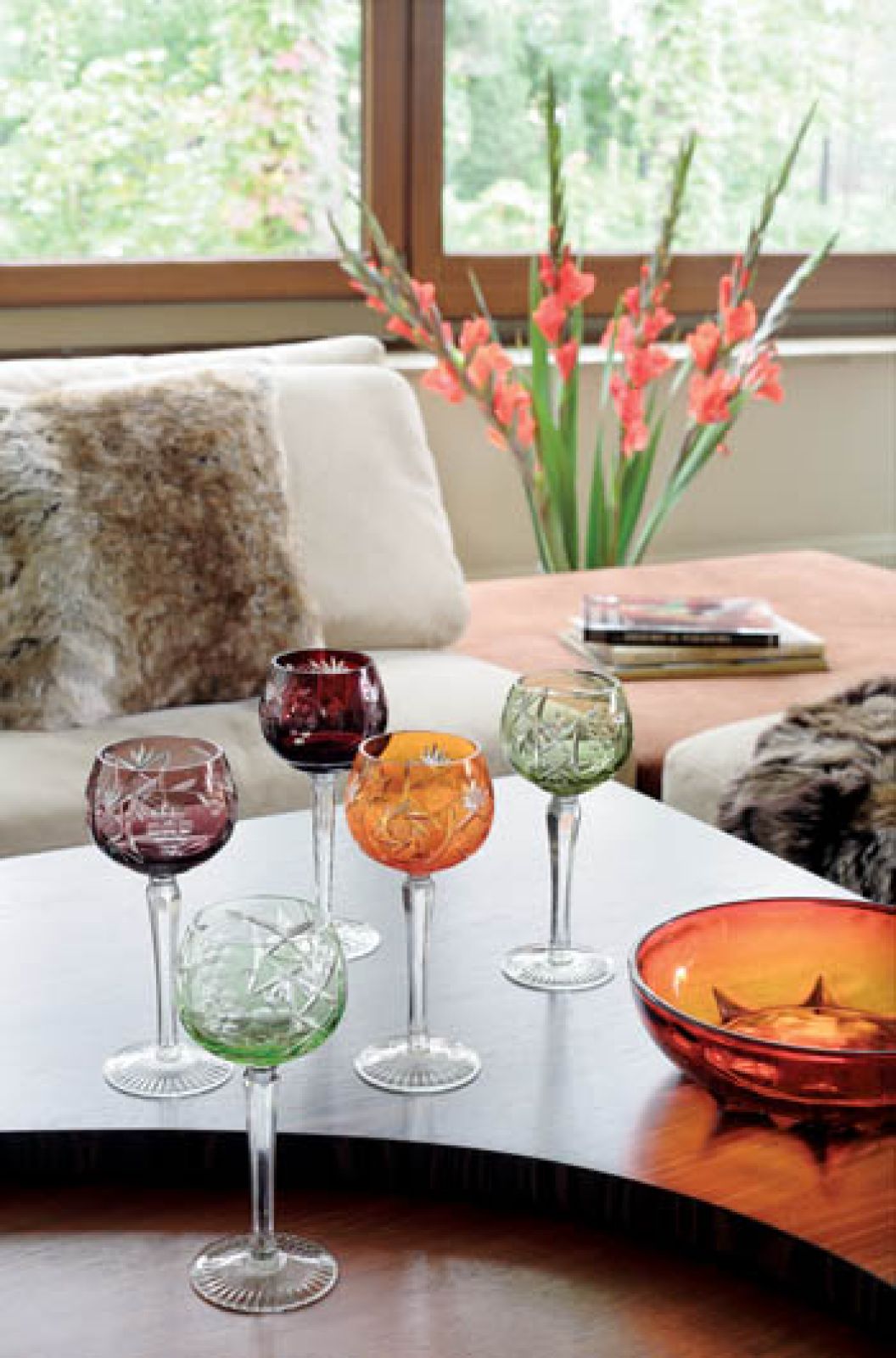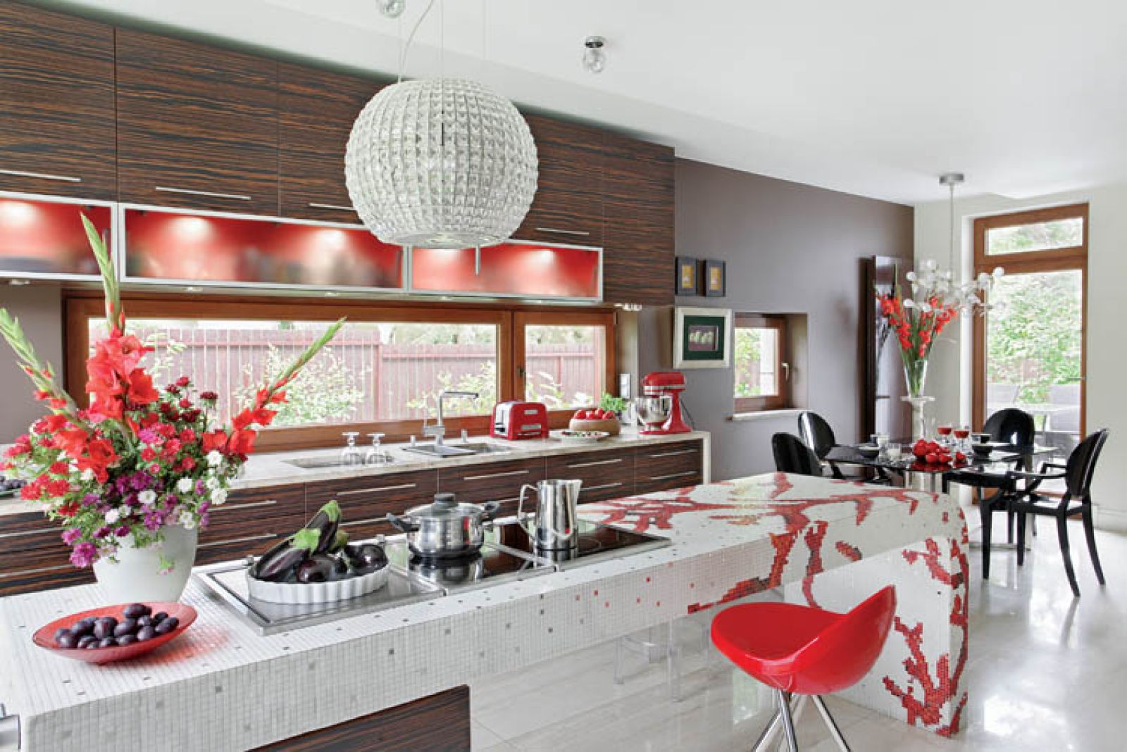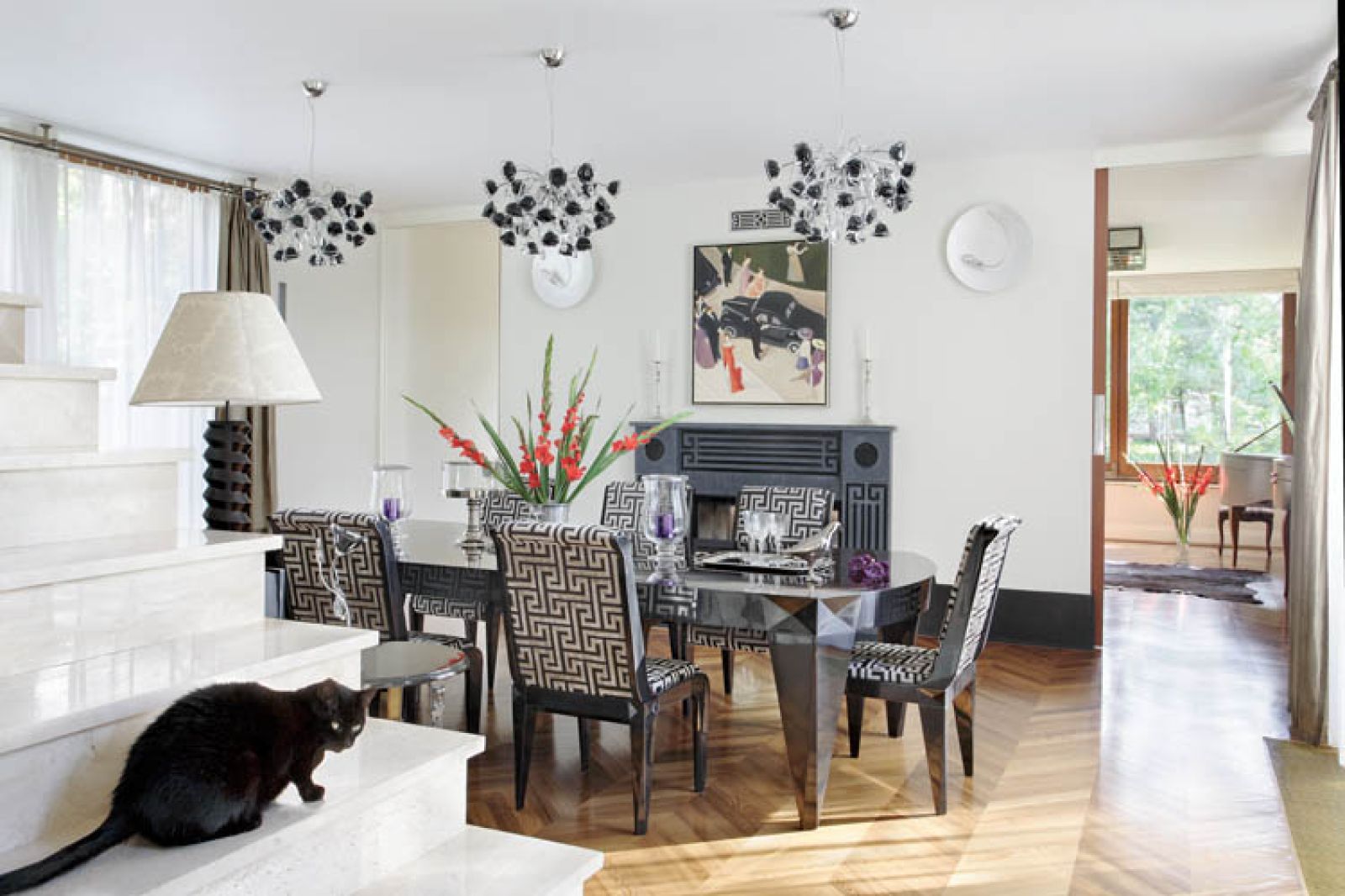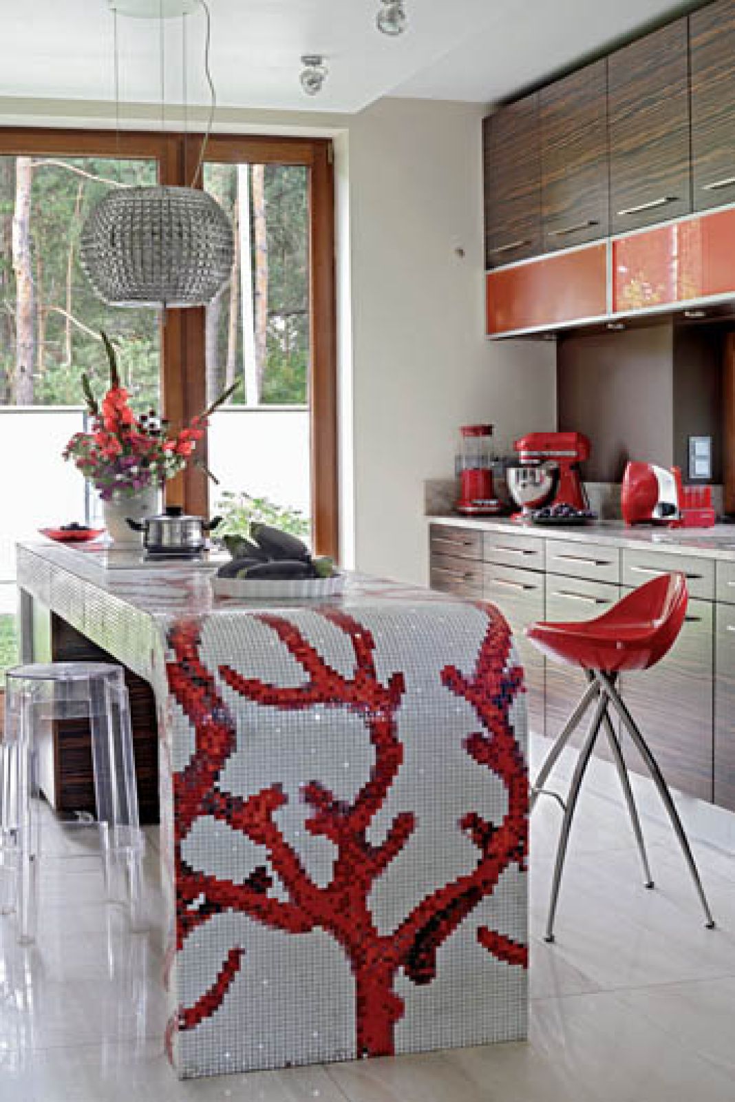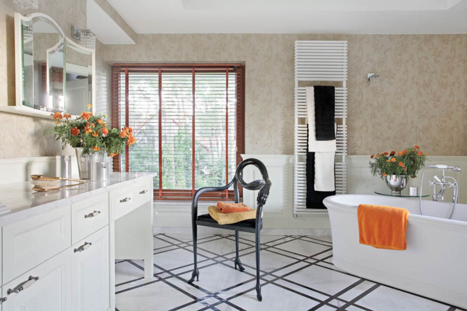 Nad ostatecznym wyglądem domu dyskutowali całą rodziną, zarywając noce. Paweł przeforsował przesuwane drzwi na słoneczny taras, dzieci dostały garderoby, a Dorota kuchenną wyspę wyłożoną mozaiką Bisazzy z motywem czerwonego koralowca. Wszyscy zgodzili się na jesionową klepkę w pokojach i trawertyn na podłodze w holu, kuchni i na schodach. To miękki kamień, uprzedzał Krzysztof, za sto lat może się wytrzeć w przejściach, tak jak progi w starych kościołach. Ale co tam, to tylko doda mu uroku. I jeszcze jedna odważna decyzja: kwiaty, które widać w holu i za schodami od strony jadalni. Zakwitły dzięki Agnieszce Dąbrowskiej, która siedząc na drabinie, wydrapywała je nocami w morderczo trudnej technice sgraffito.