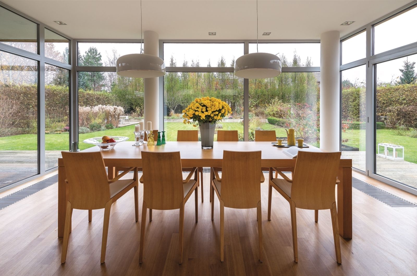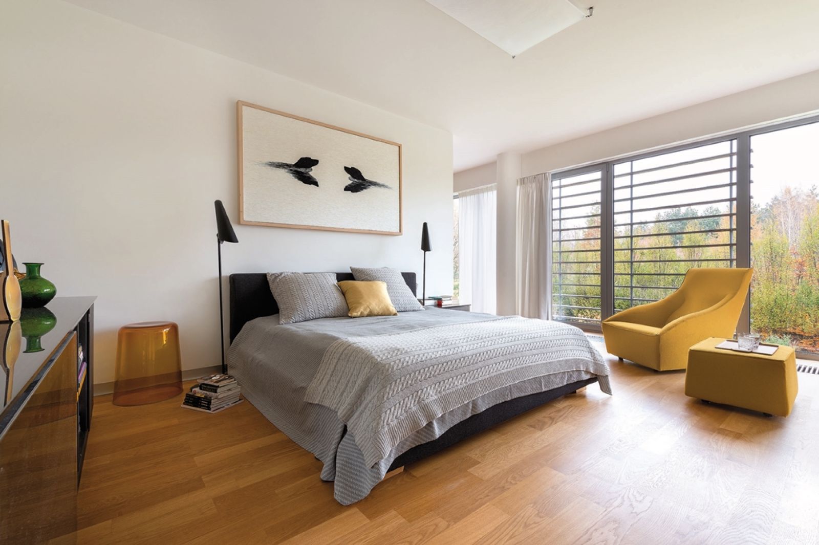 Kuzyn obiecał im projekt domu w prezencie ślubnym. Ale dopiero 20 lat później poprosili go o pomoc – wtedy zaczęli marzyć o miejscu na swoje rozliczne kolekcje. Architekt Piotr Szaroszyk wymyślił prostą bryłę – 300 metrów – z ogromnymi oknami. Dorota Szaroszyk zaprojektowała wnętrza, w tym m.in. ogromne regały na sztukę, książki i design.