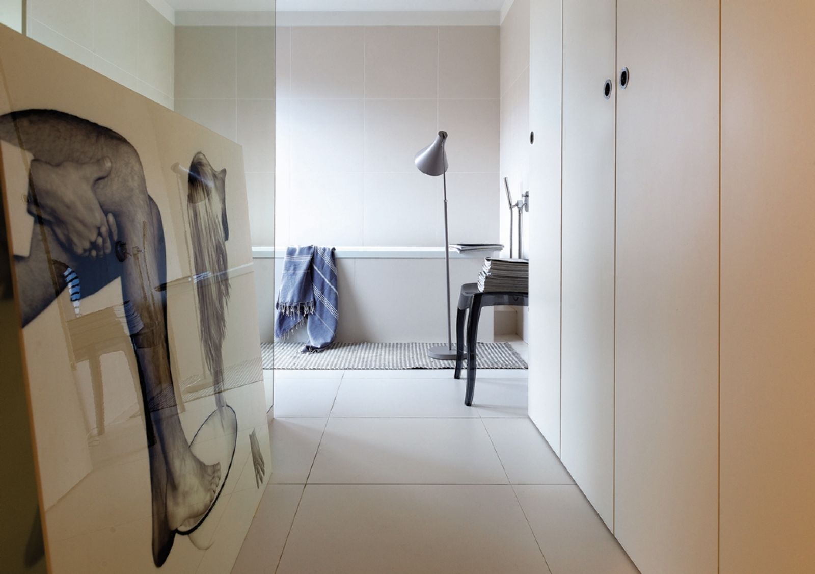 Na początku obrazy podpierały ściany. Aż w końcu gospodyni poprosiła o pomoc koleżankę, wezwały ekipę techniczną i rozmieściły płótna na ścianach tak, jak im intuicja podpowiadała. Z myślą o dziełach sztuki powstał też regał w salonie. Trafiła tam „Inwokacja” Oskara Dawickiego, oprawiona we fragmenty starych ram. Sąsiaduje z albumami o sztuce, designie i architekturze.