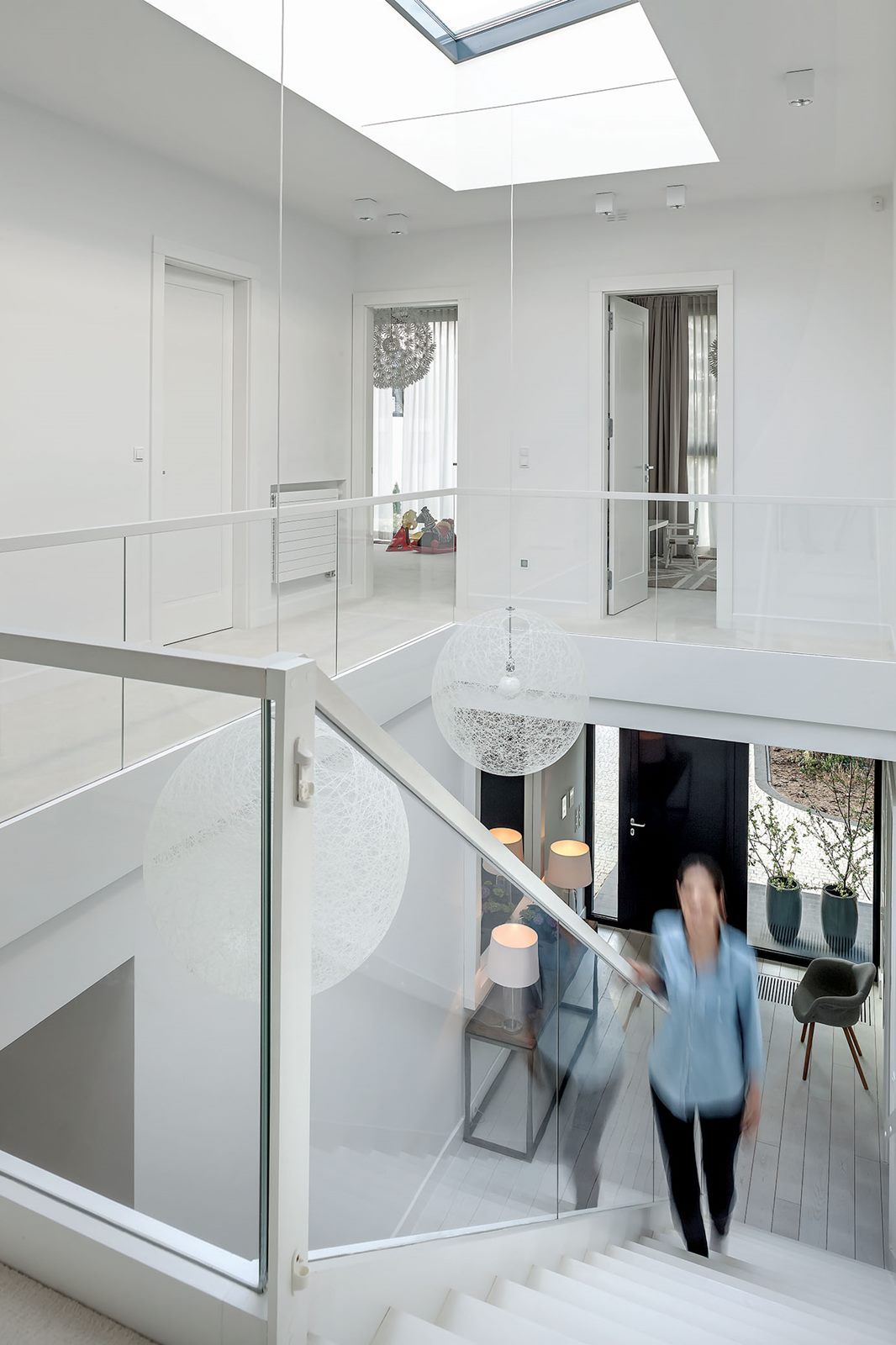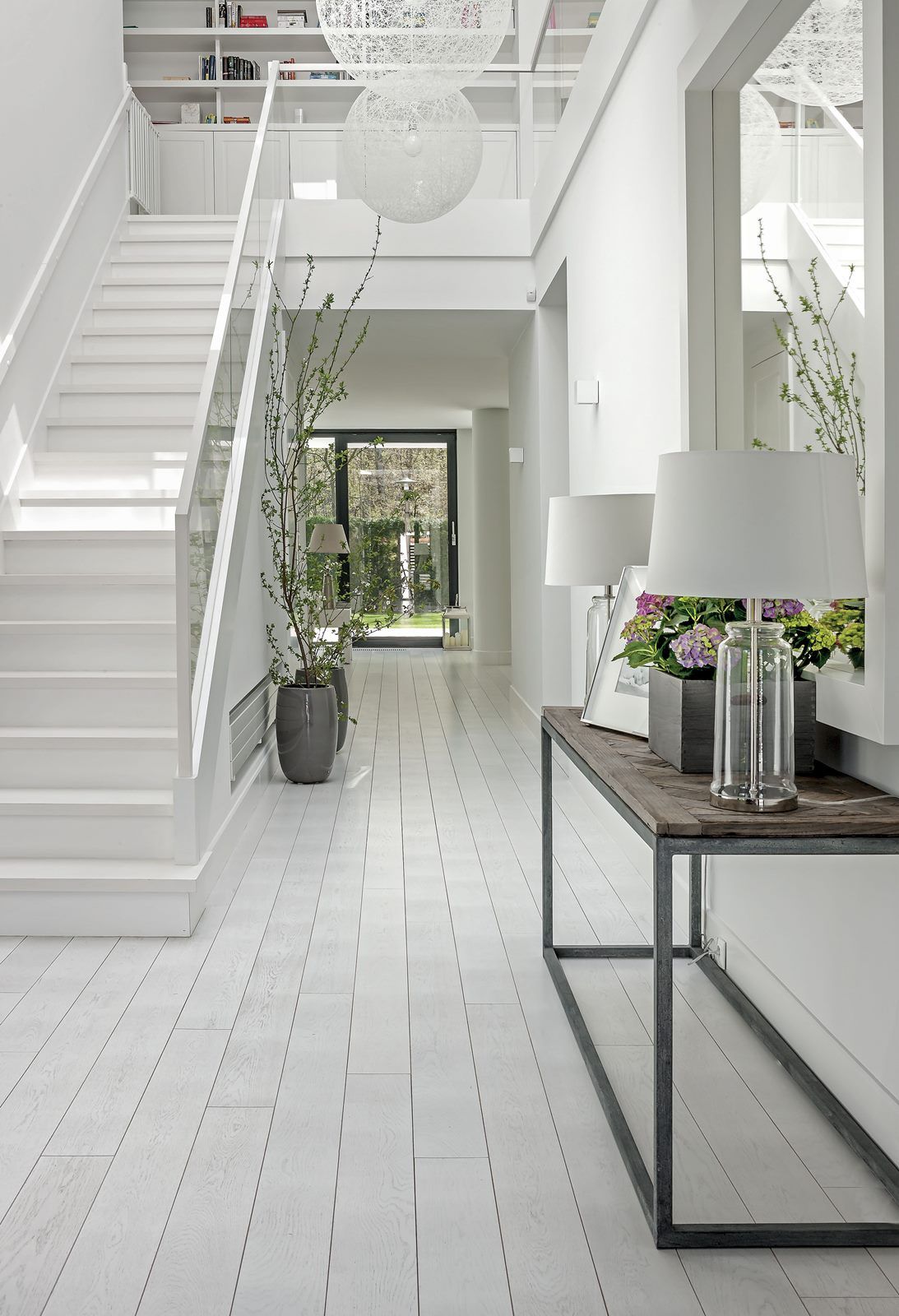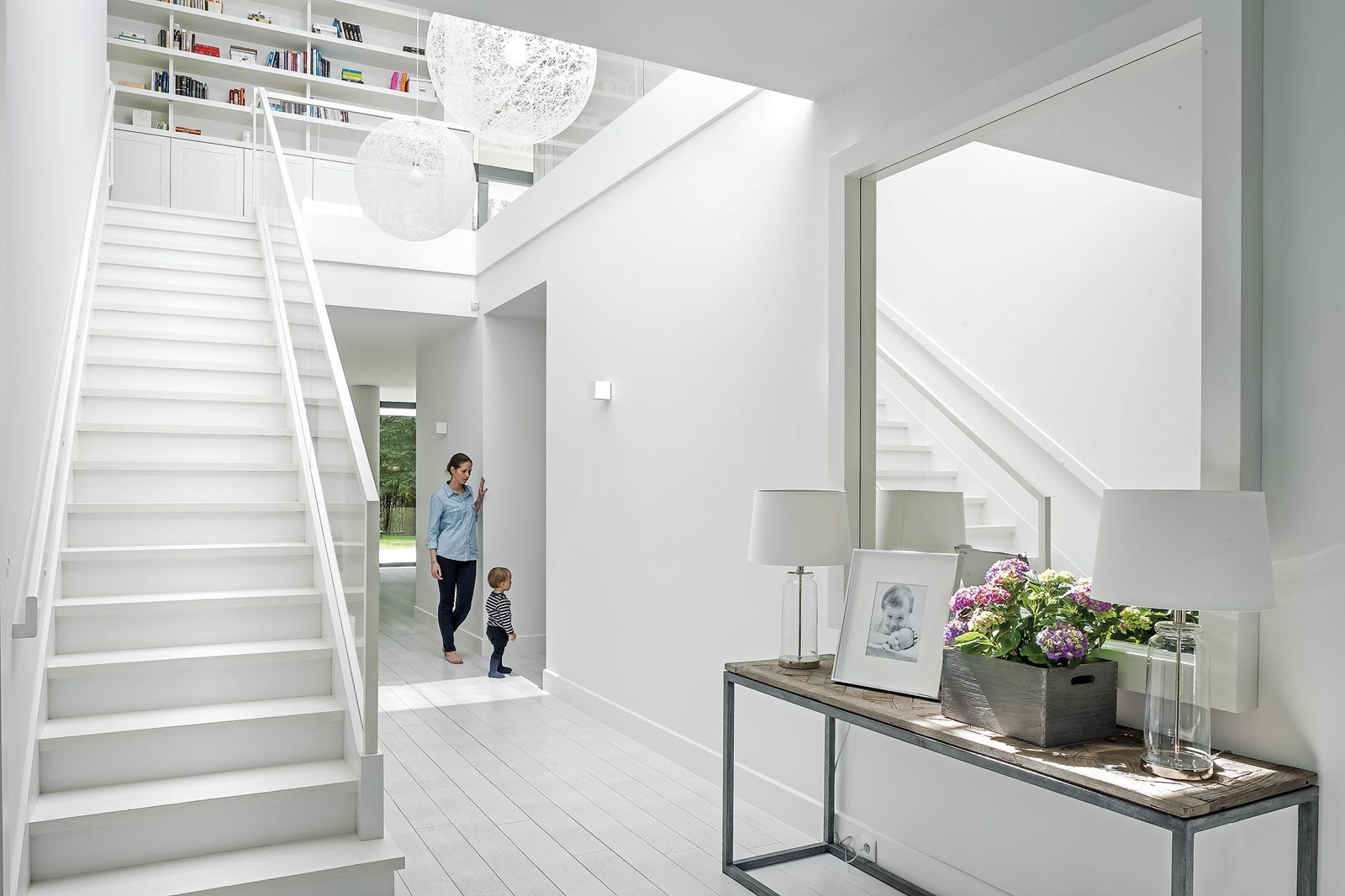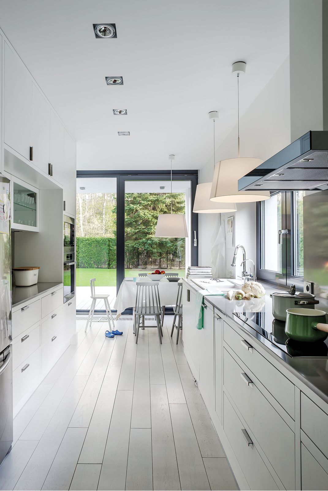 Po dwóch stronach ściany domu to okna: pas szkła ciągnie się wzdłuż kuchni, jadalni i salonu na parterze i od łazienki po sypialnię na piętrze. W dachu nad wysokim, przestrzennym holem zamontowano świetlik, dzięki któremu jest jasno nawet wtedy, gdy nie ma słońca. Ania: – To niezwykłe miejsce. Kiedy zapada zmierzch, zapalamy te dwie olbrzymie kuliste lampy, które wiszą na specjalnym druciku. W dzień go widać, w nocy nie. Hol wygląda wtedy niesamowicie, jak planeta, nad którą wzeszły dwa księżyce w pełni. Uwielbiam przez tę szybę oglądać niebo i słuchać, jak bębni w nią deszcz. Świetlik mamy także w garderobie, to dobry pomysł.