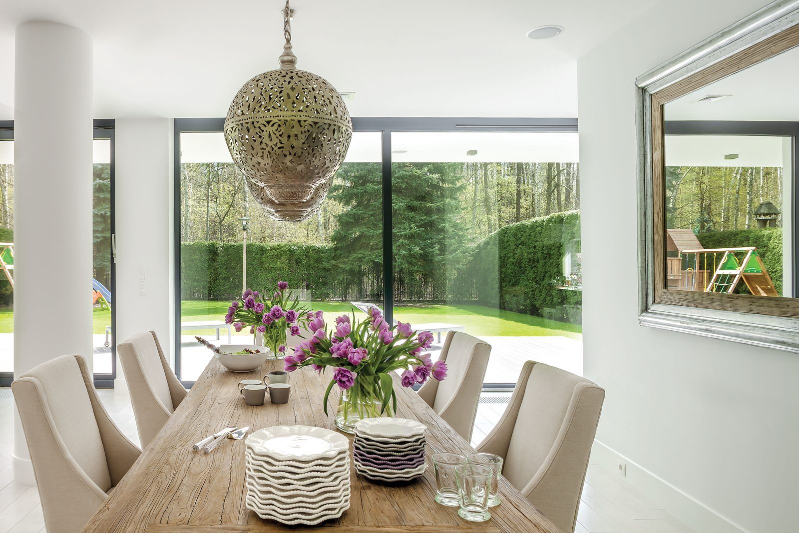 Urządzaniem wnętrz zajęli się sami. Pojechali do Paryża na targi Maison & Objet, żeby podpatrzeć najnowsze trendy, i wszystko stało się jasne. Dosłownie. Ania zrozumiała, że na podłodze położy białe deski, że kanapy będą w naturalnych lnach, a stół ze starego, wyszczotkowanego drewna dębowego. Od razu zresztą meble zamówili. Stół przyjechał z Hiszpanii, krzesła i sofy z Holandii, podobnie jak efektowne srebrne żyrandole nad blatem. To dzieło firmy Zenza, która ma marokańskie korzenie, a jej właściciele zatrudniają afrykańskich rękodzielników. Projekty powstają jednak w Holandii, dlatego lampy są jednocześnie i tradycyjne, i nowoczesne. – Mamy oczywiście oświetlenie halogenowe, ale rzadko go używamy. Gra świateł i cieni, jaką dają te lampy, tańczące arabeski na ścianach, są wręcz magiczne.