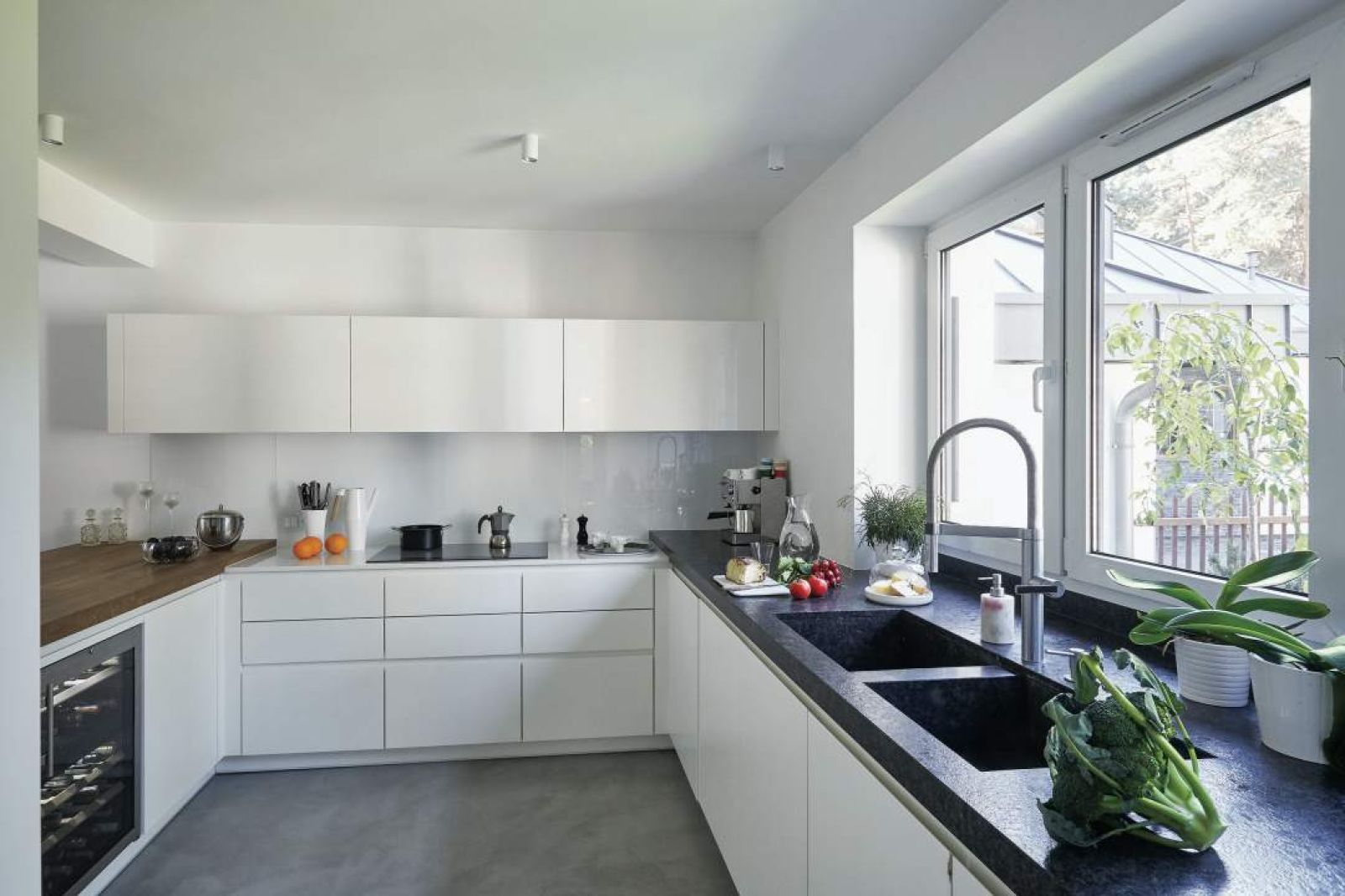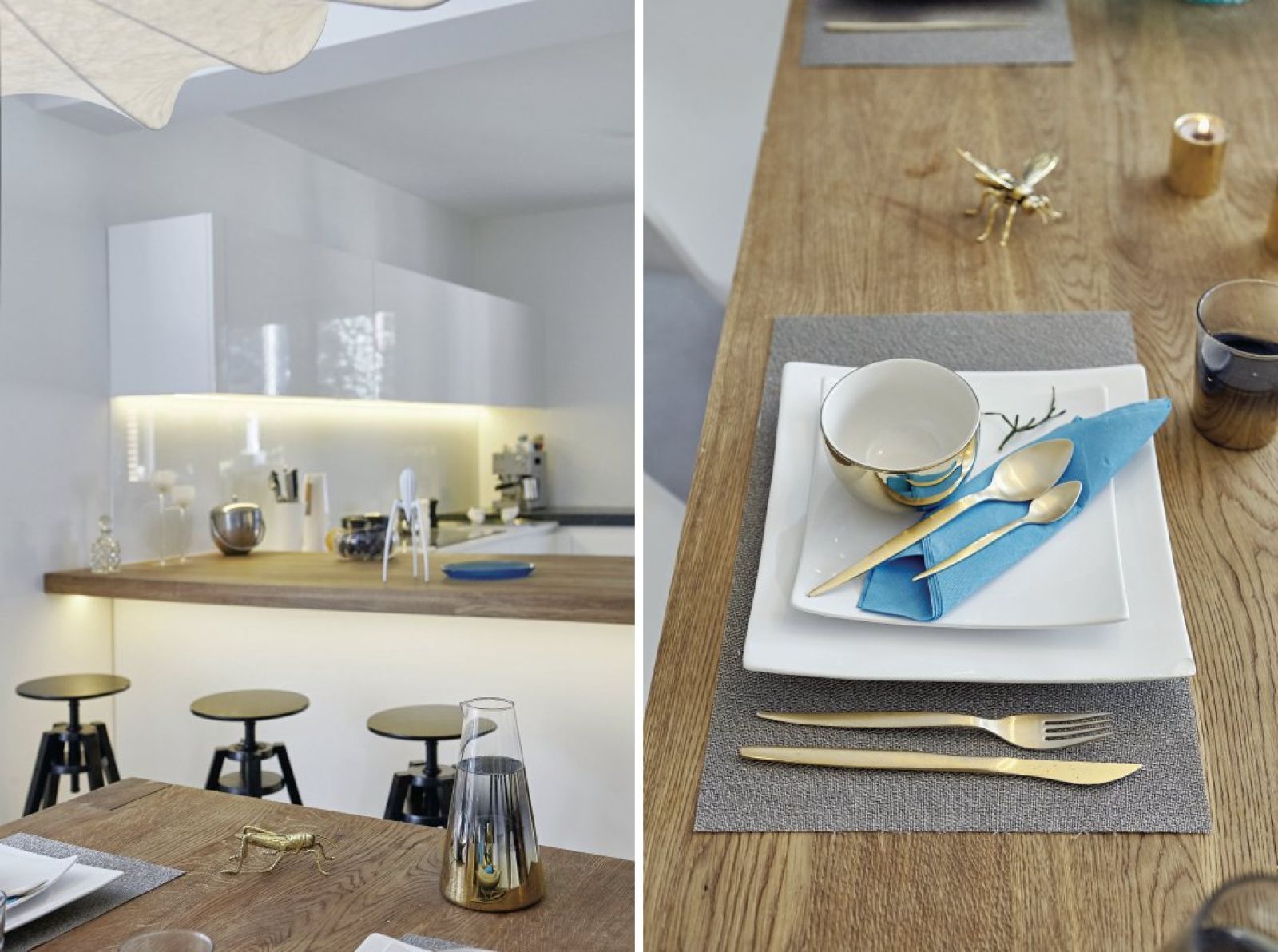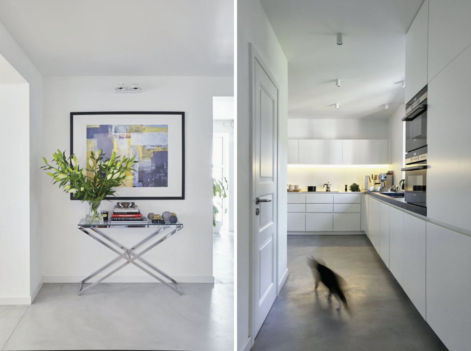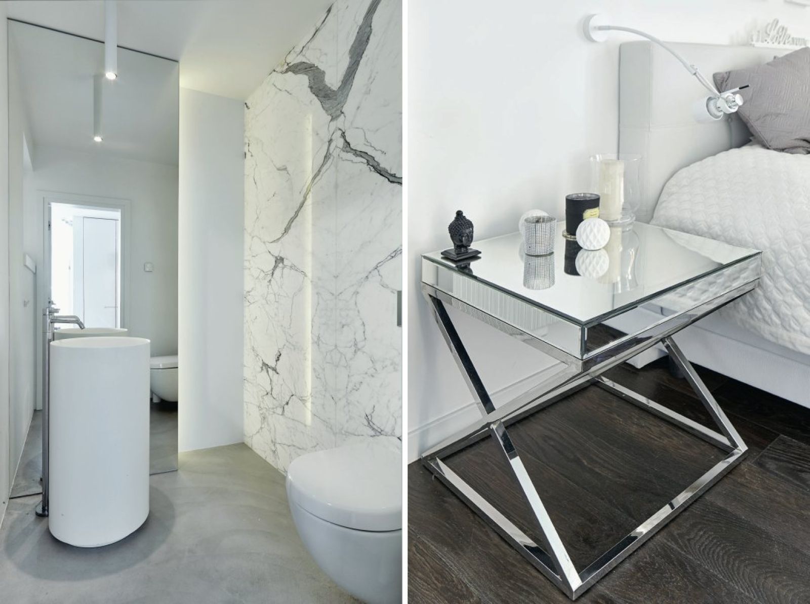 We wnętrzach Maja chciała połączyć to, co bliskie jej sercu – bezpretensjonalny skandynawski minimalizm i włoską ekstrawagancję. Czy to musi być sprzeczność? Okazuje się, że niekoniecznie. Udało jej się połączyć naturalne materiały z akcentami kryształowymi, połyskującym metalem i futrami. Osiągnęła równowagę „temperatur”: różne gatunki kamienia (marmur, granit, kwarcogranit, basaltina oraz łupek), które niosły ze sobą pewien chłód, przełamała elementami drewnianymi. Na wyższe kondygnacje wybrała deski szczotkowanego, wędzonego dębu, na parter zaś coś bardziej praktycznego – jasne posadzki na bazie cementu i żywicy włoskiej firmy Colledani. Przy kolorach wykazała żelazną konsekwencję – tło, meble i dodatki bazują na bieli, szarości i ciepłym kolorze drewna.