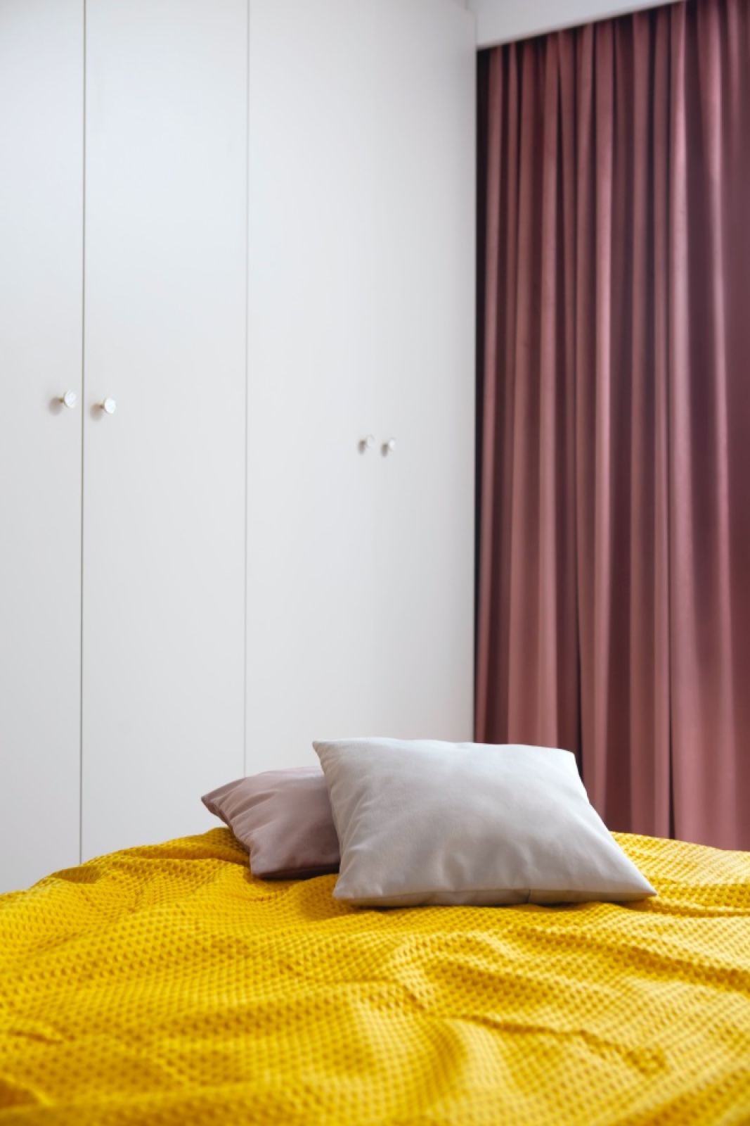 Najspokojniejsza jest sypialnia. Nic dziwnego, w końcu to pokój, w którym szukamy wyciszenia i odpoczynku po całym dniu. Urządzono ją w pastelowych kolorach i udekorowano miękkimi tkaninami, które sprawiają, że wnętrze jest przytulne i sprzyja relaksowi. – W sypialni wykorzystałem sztukaterię naścienną charakterystyczną dla wnętrz dziewiętnastowiecznych kamienic – wspomina Paweł. Za pomocą sztukaterii na jednej i zabudowy meblowej aż do samego sufitu na drugiej ścianie, projektant optycznie powiększył niewielkie wnętrze.