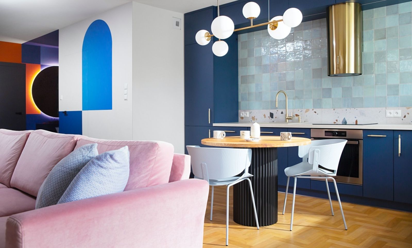 Niebieska kuchnia, pastelowa sypialnia i pomarańczowa łazienka