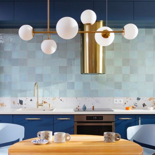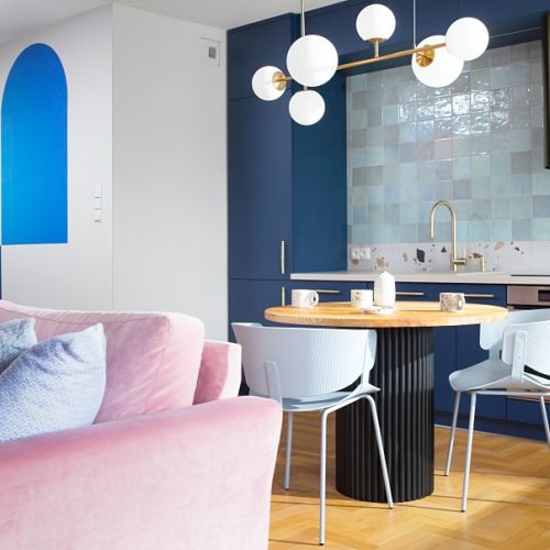 W mieszkaniu wiele się dzieje. Pomarańczowo-granatowy przedpokój już od progu wprowadza nas w klimat artystycznego wnętrza. Podświetlane lustro na tle geometrycznych wzorów na ścianie wygląda zupełnie jak dzieło sztuki. Modna, kolorowa kuchnia jest otwarta na salon. Pomiędzy niebieskimi szafkami, położono turkusowe kafle i okładzinę ze wzorem lastryko, które cały czas cieszy się wielką popularnością w aranżacji wnętrz. Złote elementy, takie jak okap, bateria umywalkowa, uchwyty i lampa wisząca nad stołem, dodają elegancji kuchennej aranżacji. Stół jadalniany z czarną, ryflowaną nogą, wyróżnia się nowoczesnym designem. Na jego drewnianym blacie zobaczymy ręcznie robioną ceramikę kieleckiej artystki Klaudyny Kozieł (do kupienia w klostore.pl).