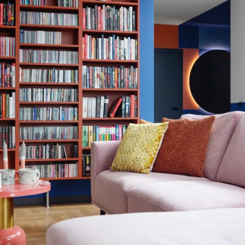Niebieski kolor szafek kuchennych powtarza się na ścianach w salonie, do różowej sofy w salonie nawiązuje łóżko w sypialni tapicerowane tkaniną w podobnym odcieniu, zaś o barwach ścian w przedpokoju przypominają pomarańczowe akcenty w łazience. W ten sposób wnętrza współgrają ze sobą. Poprzez powtórzenie tych samych kolorów i materiałów w różnych pomieszczeniach projektantowi udało się zachować spójność całego mieszkania.
