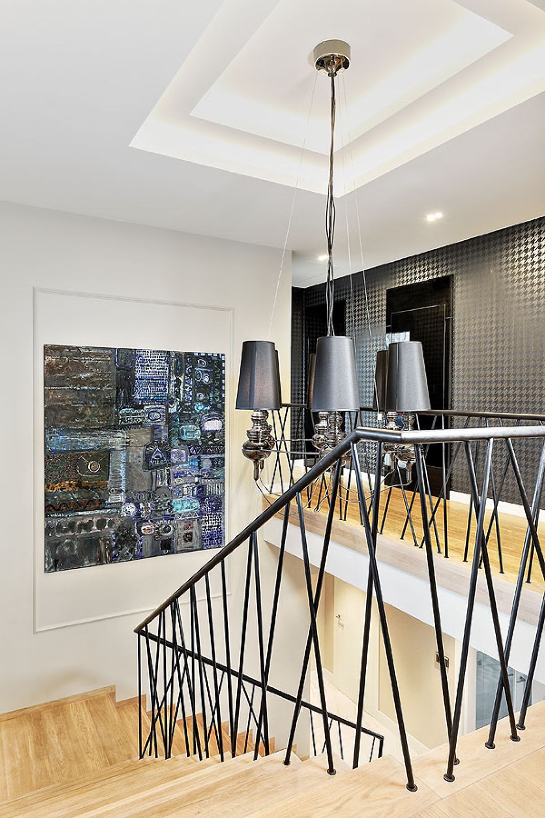 Oryginalną czarną graficzną balustradę schodów Agnieszka podpatrzyła na luksusowym osiedlu w Krakowie. Niełatwo było znaleźć wykonawców tak nietypowej konstrukcji. W końcu zadania podjął się artysta rzemieślnik, któremu cały dzień zajęło przykręcanie elementów.
