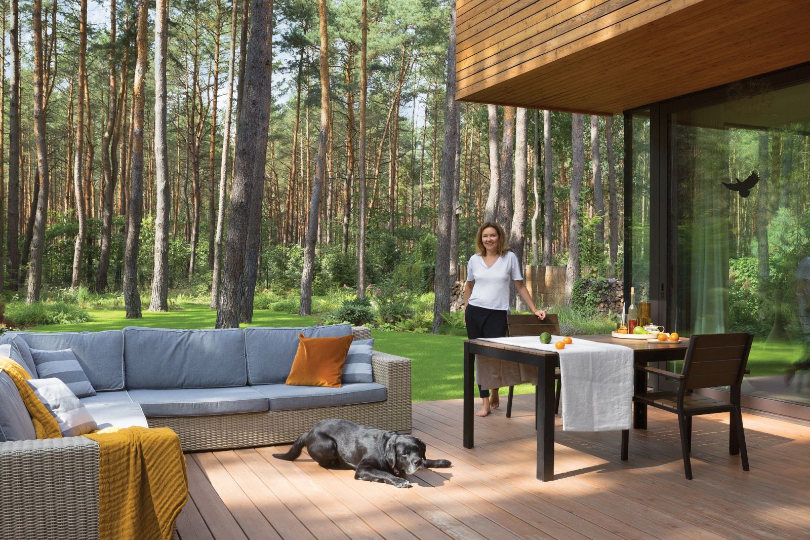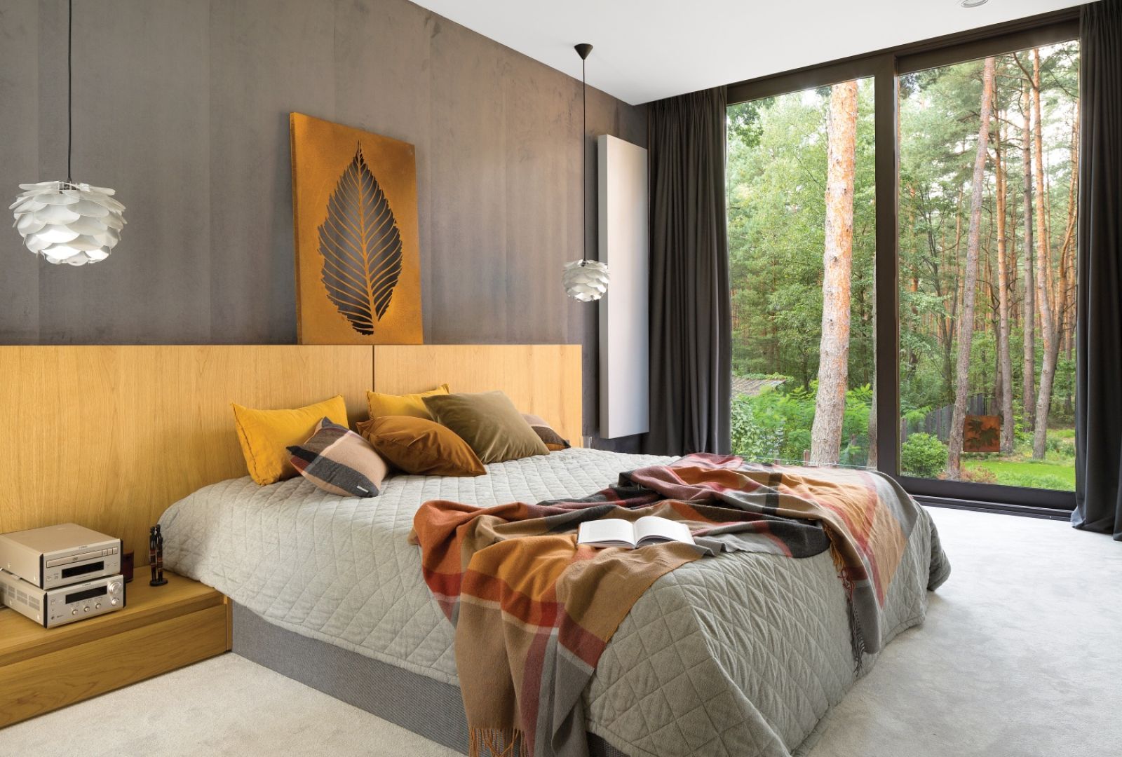 W sypialniach na piętrze okna też są od podłogi do sufitu, wszystkie na stronę lasu. Ania i Rafał, leżąc w łóżku, słuchają ptaków i obserwują szalone gonitwy wiewiórek na dębach sąsiadów. Przyroda ich otacza – pod tarasem mieszka mysz, do płotu podchodzą łosie, a dzięcioł robi dziury w elewacji – chyba pomylił modrzewiowe deski z drzewami. – Bardzo nas to cieszy – mówi Ania – wybudowaliśmy ten dom, żeby być blisko natury. Spędzamy na tarasie wszystkie ciepłe dni, a ja odkryłam w sobie ogrodniczkę. Dostaliśmy też od przyrody niezwykły bonus – gdy wieje wiatr od puszczy, słychać szum, jakbyśmy byli nad morzem.