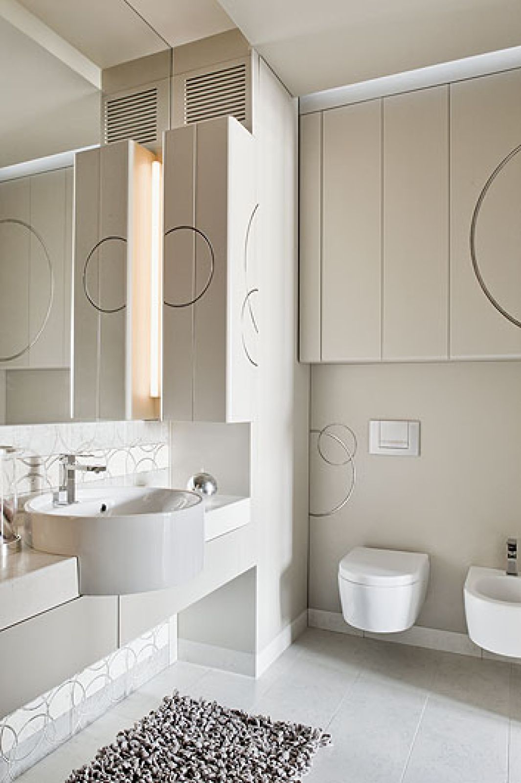 Wszystko tu jest przemyślane. Na przykład wisząca bryła-szafa oddzielająca salon od korytarza ma aż trzy odcienie beżu, połysk i mat oraz dodatkowo wyrazistą fakturę. – Dla mnie liczą się niuanse, a nie efekciarskie zagrania – mówi Aleksandra. Wnętrze miało być czyste. Gra architektoniczna forma, nie dekoracje. Styl i szyk widać w detalach.