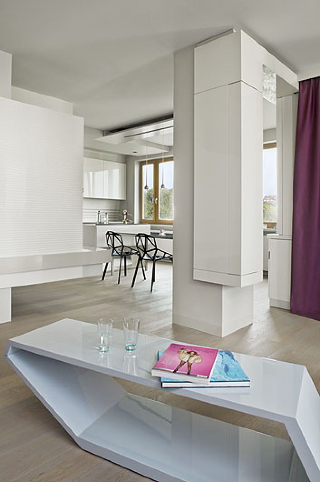 Aleksandra w architekturze ceni nowoczesność. W wystroju – futurystyczny, wręcz kosmiczny rys. Lubi też polskich projektantów i artystów. Dlatego kanapa, fotel (wzorowany na siedzeniu pilota myśliwca) i krzesła to jedyne zagraniczne sprzęty. – Mamy naprawdę dobrych dizajnerów i dobrą sztukę – wyjaśnia właścicielka. Apartament wygląda więc trochę jak showroom polskiego dizajnu. Większość mebli – w tym szafę, wyspę kuchenną i geometryczny stolik – zaprojektował architekt Paweł Kaczmarczyk. Są też pompowane meble Oskara Zięty.