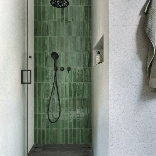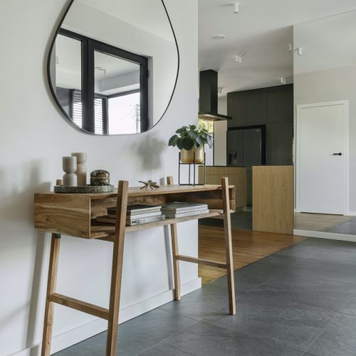 Stanisław Sibilski zwraca uwagę, że całość wnętrza spajają powtarzające się motywy, wprowadzają spokój i harmonię. Jasne drewno znajdziemy na kuchennej wyspie i w zabudowie łazienkowej. Butelkowa zieleń kanapy powtarzana jest w szafce w sypialni i na łazienkowych płytkach.