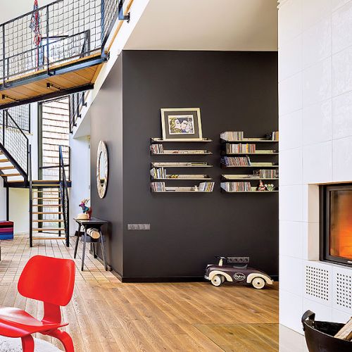 Poza wiejskimi klimatami od architektów chciała jednego: salonu wysokiego na dwa piętra, żeby zmieściła się biblioteka. Dom jest węższym bokiem zwrócony do wjazdu. To, co w środku, miało wynikać z mazowieckiej tradycji, zachowano więc symboliczny podział na izbę jasną, świąteczną, czyli salon, oraz ciemną – z kuchnią, pomieszczeniami gospodarczymi, spiżarnią. Granicą między nimi jest ogromny piec kaflowy z paleniskiem otwieranym na obie strony, dzieło Krystyny Kaszuby-Wacławek z Manufaktury Ceramicznej. – Pogodził pokolenia – śmieje się Paulina. – Nawet ci, którym nie podobają się nowoczesne wnętrza, przystają na jego widok i mówią: „Ale piec to macie piękny!”.