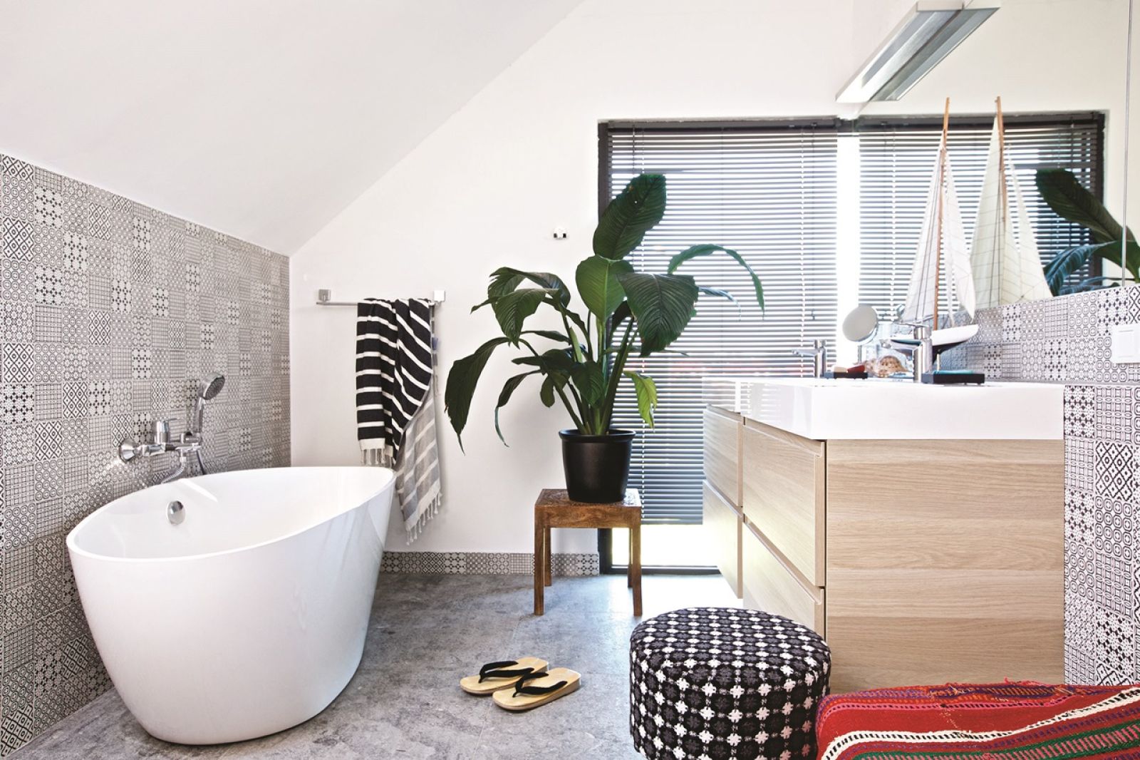 We wnętrzach właściciel połączył modernistyczne meble i bibeloty z podróży