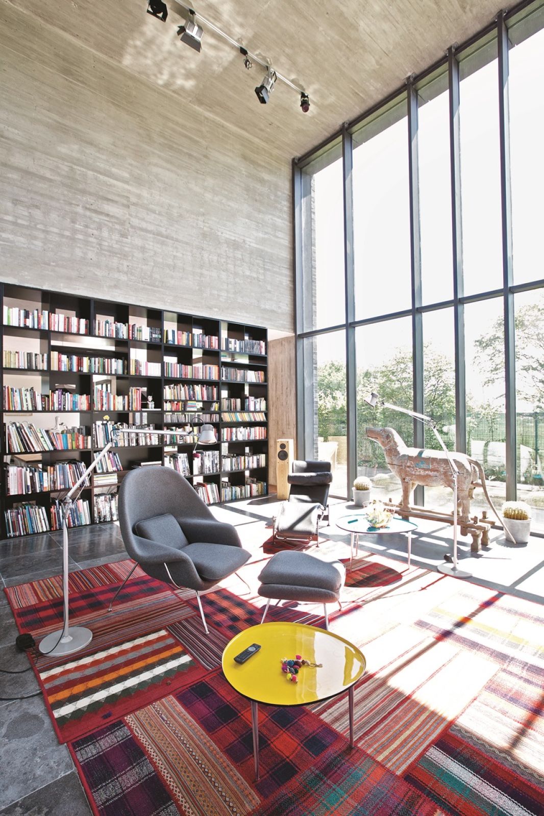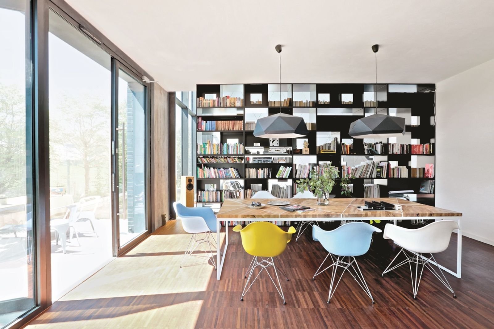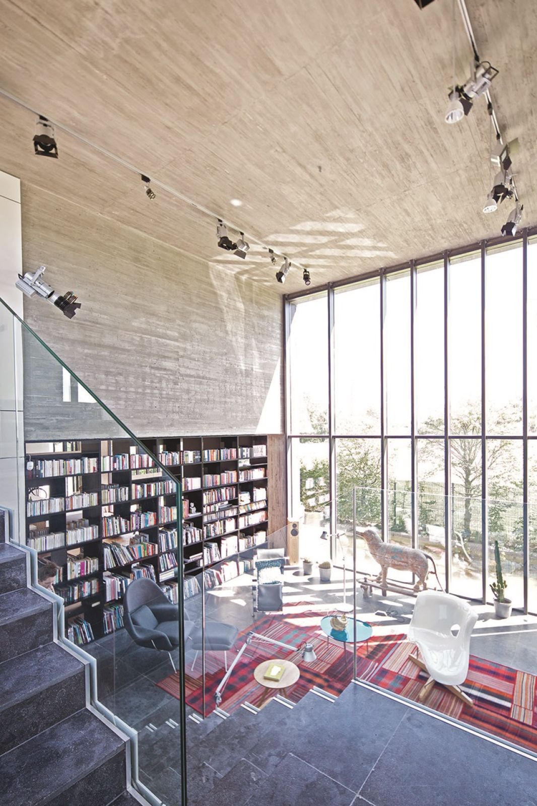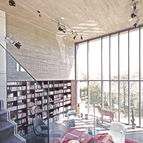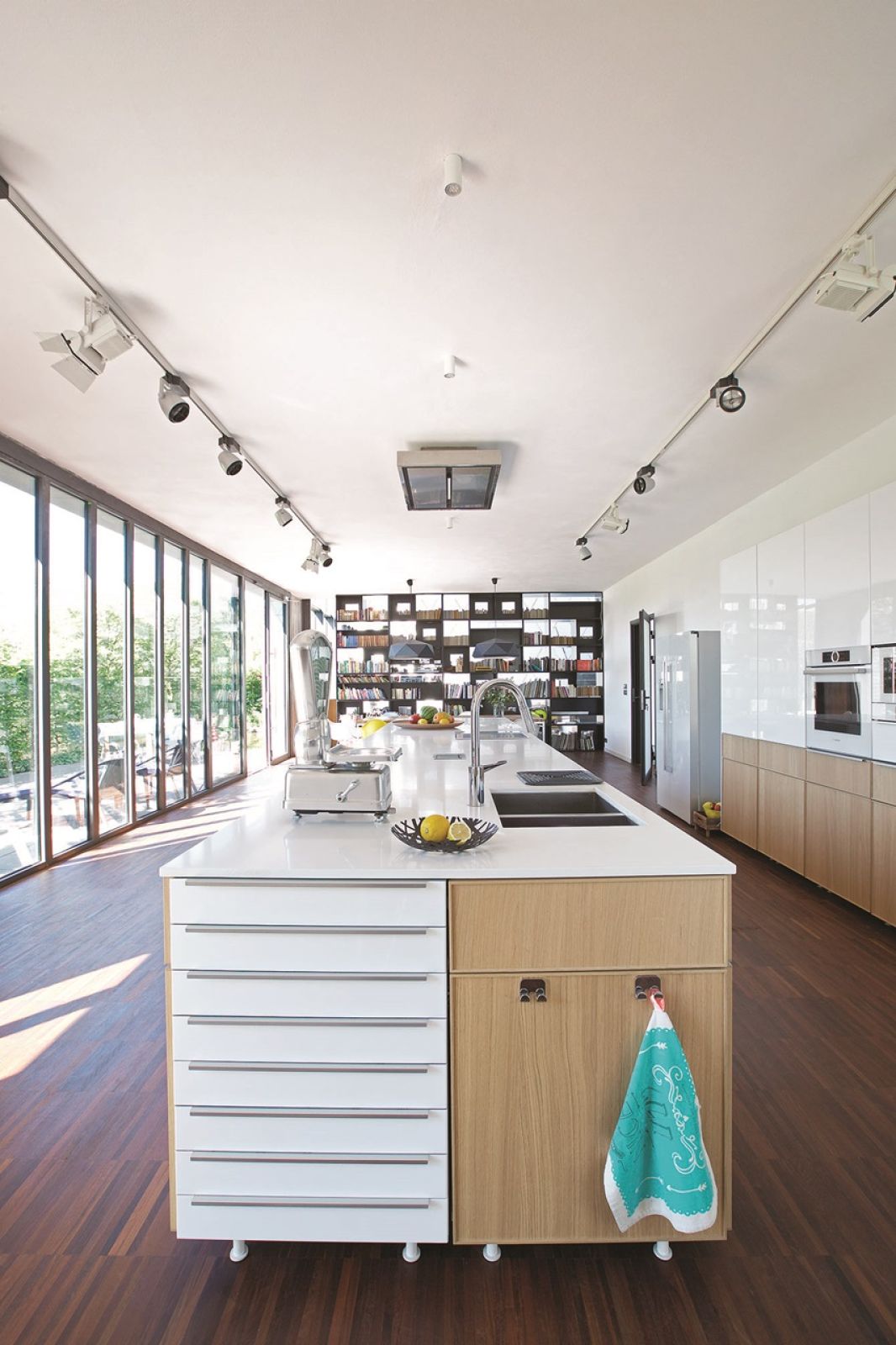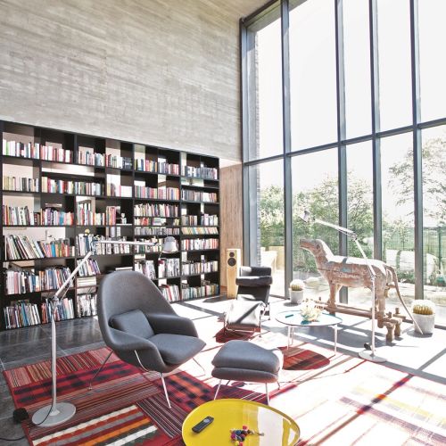 Cały dom podzielony jest klasycznie na dwie strefy. Z atrium schody na górę wiodą do prywatnej przestrzeni rodziny. Na dole z przeszklonym pomieszczeniem sąsiaduje kuchnia połączona z jadalnią. Linię podziału wyznacza zaprojektowana przez właściciela biblioteczka. Śmieje się, że nie może być inaczej w domu człowieka, który współtworzył projekty dwóch uniwersyteckich bibliotek – w Warszawie i Wrocławiu – a jego żona Joanna jest współwłaścicielką wydawnictwa Dwie Siostry.