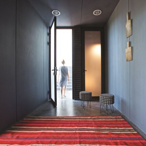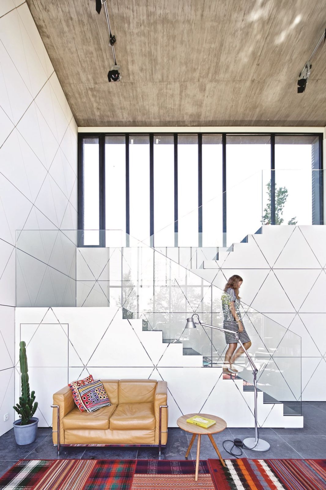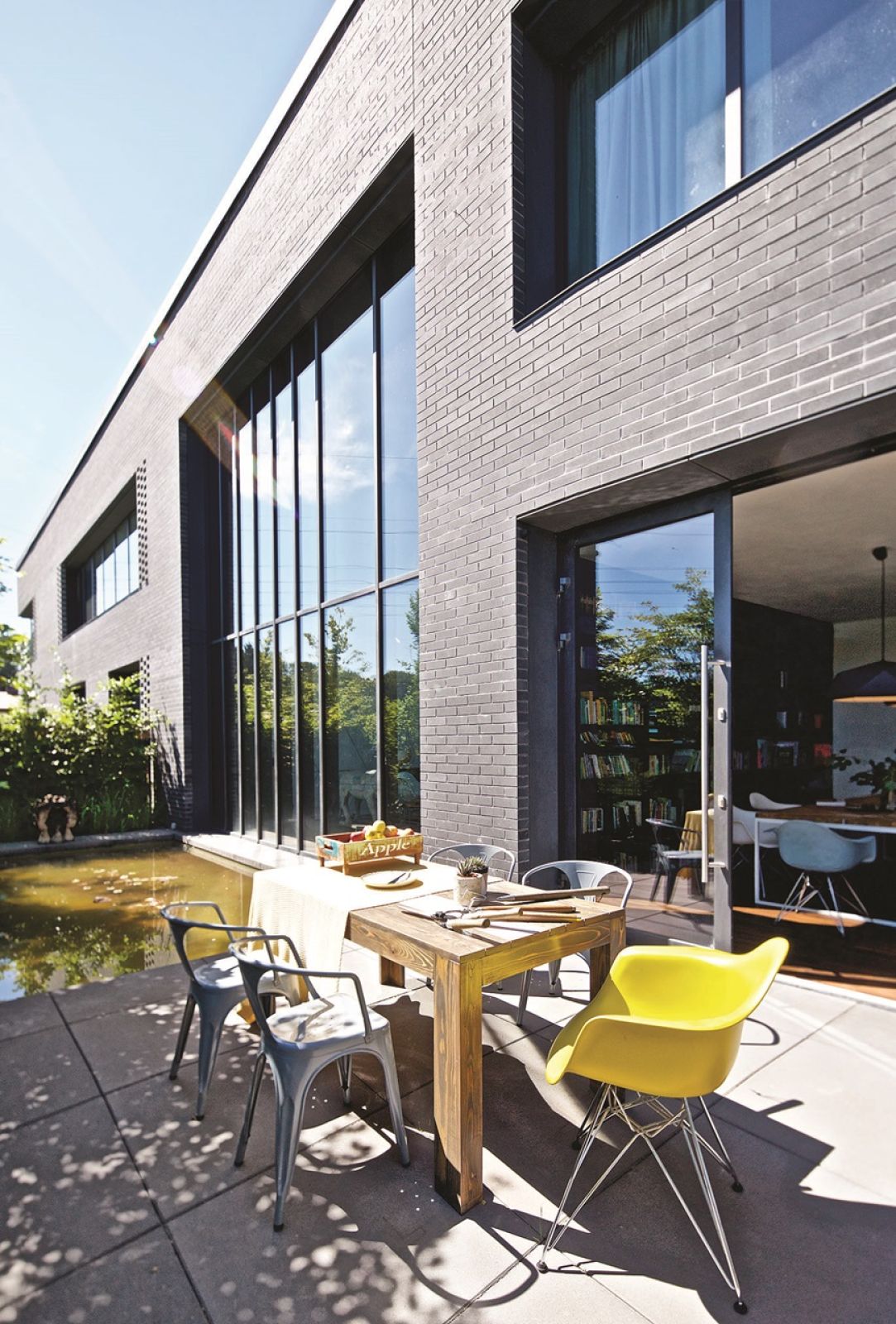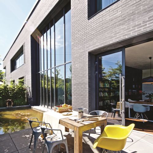 Wynika z analizy miejsca i potrzeb – tłumaczy Jacek. – W tym przypadku miejscem była wąska, lecz długa działka z widokiem na leżące odłogiem pole i słup wysokiego napięcia. – Najbrzydsza, jaką w życiu widziałem, ale dzięki temu tania – opowiada architekt. Potrzebą zaś posiadanie domu z atrium. Polski klimat nie sprzyja otwartemu domowi, atrium zostało więc wyznaczone dwiema szklanymi elewacjami. Jedna łączy dom z przyrodą. Tuż za taflą szkła jest niewielki ogródek z oczkiem wodnym obsadzony karłowatymi bukami. Drzewka blokują widok na słup wysokiego napięcia i sąsiednie domy, ale jednocześnie nie zabierają światła. Zieleń za szybą zamyka domową przestrzeń.