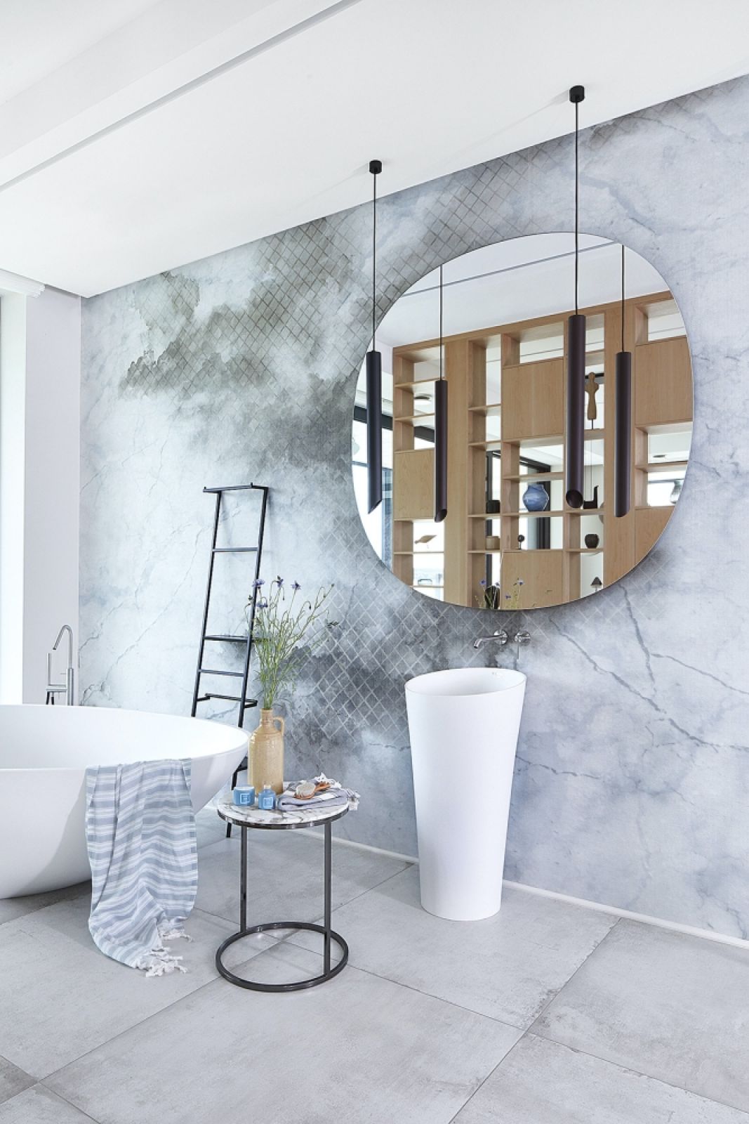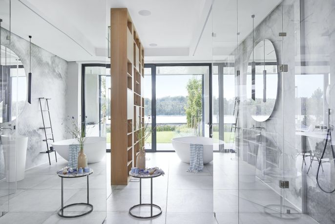 Wyzwaniem było rozplanowanie telewizorów. Zdzisław jest prawdziwym kinomaniakiem i lubi oglądać filmy z każdego miejsca. By nie mnożyć odbiorników, projektantki wpadły na pomysł z obrotową ścianą. Po jednej stronie umieściły lustro, po drugiej płaski ekran. Telewizor widoczny jest z wanny, sofy oraz kącika do pracy z biurkiem. Nie widać go tylko z kuchni, więc tam projektantki umieściły drugi odbiornik. – Wygląda jak obraz, nie rzuca się w oczy – mówią. – Najpiękniej jest tu pod koniec lata. Poranki i wieczory są rześkie, a nad jeziorem unoszą się mgły – zdradza Lila. – Mimo chłodu rozsuwam okna tarasowe i zanurzam się w gorącej kąpieli. Kłęby parującej wody stapiają się z widokiem za oknem, a ja czuję się, jakbym wypływała na środek jeziora.