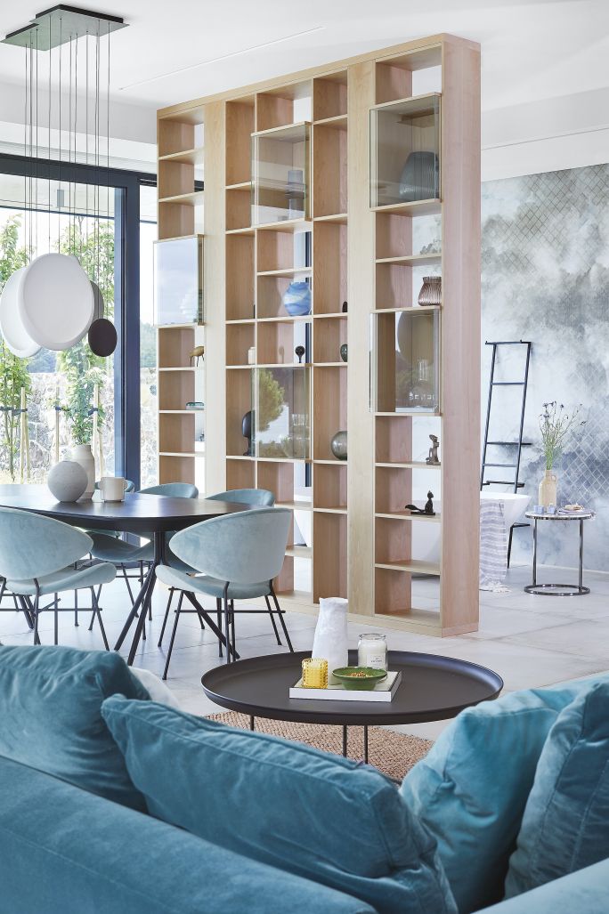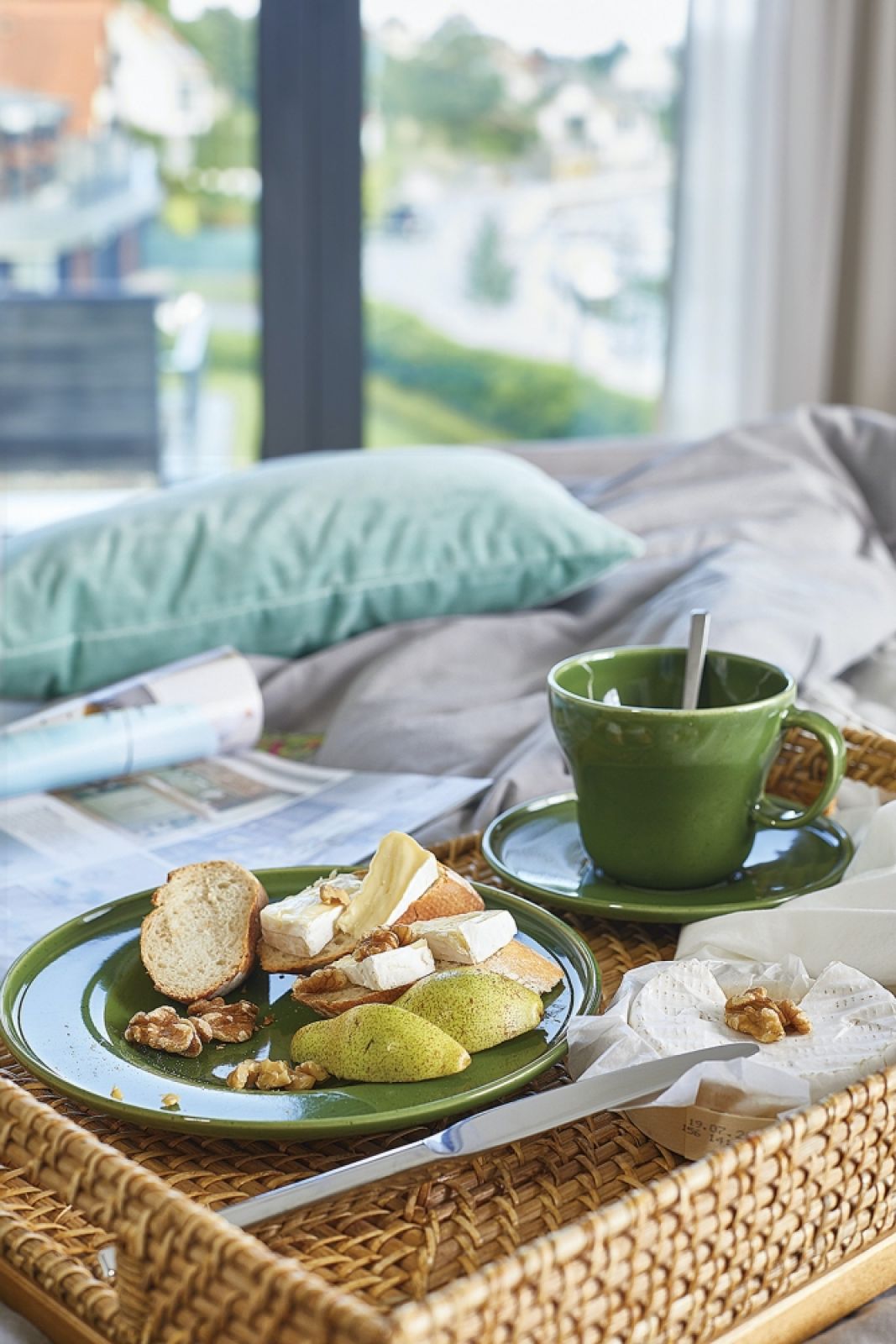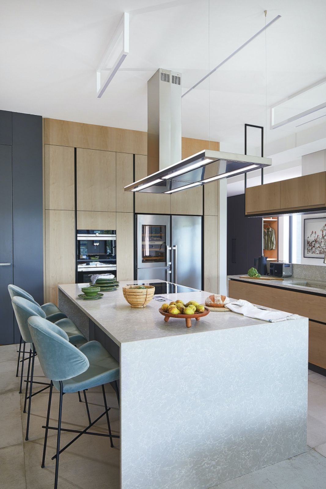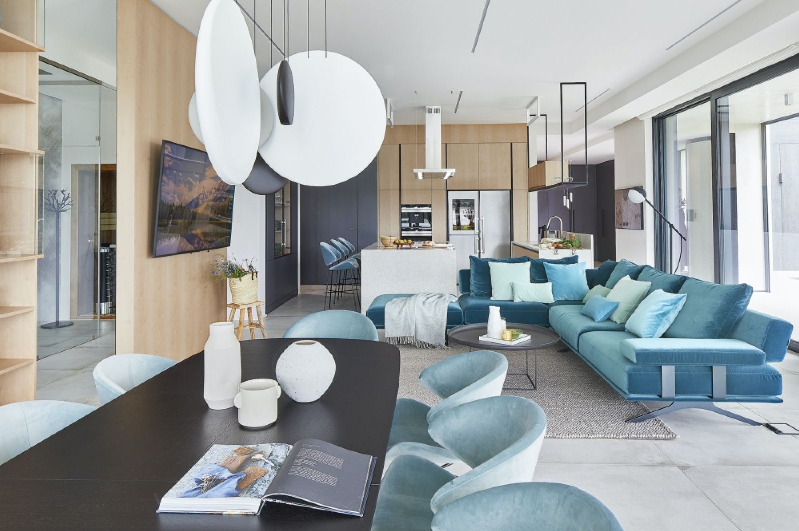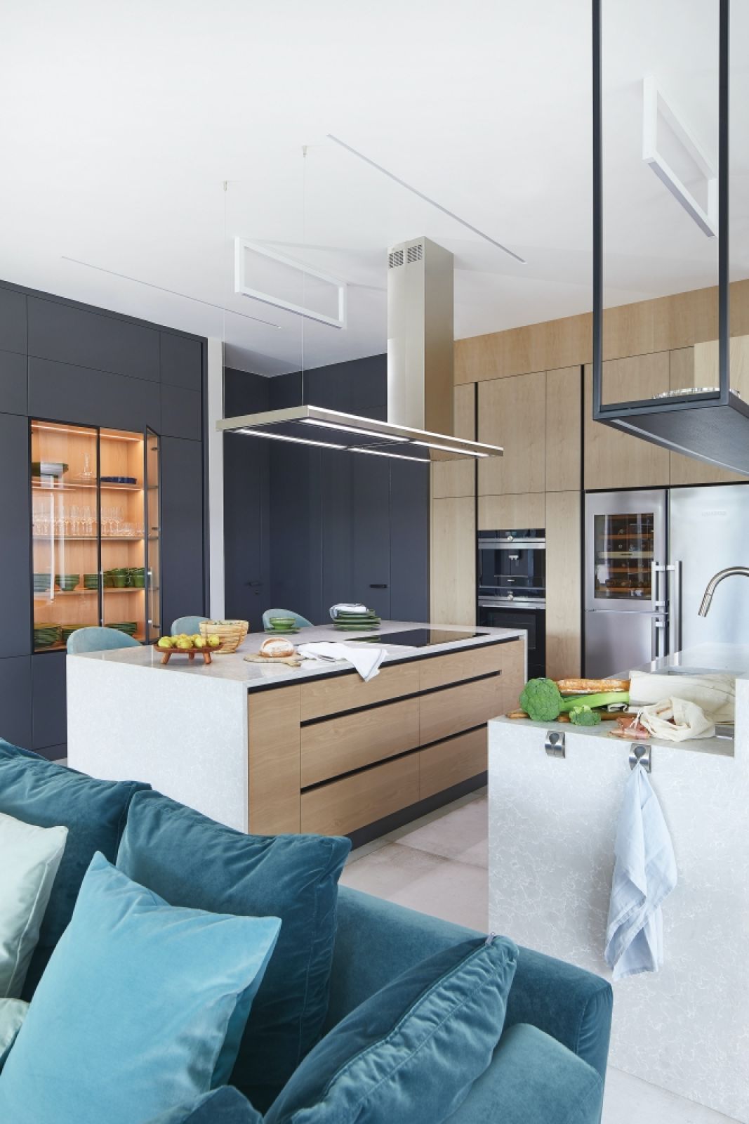Bryła budynku i pokrywający elewację spiek kwarcowy są już jednak na wskroś współczesne. Szklane balustrady nie zasłaniają widoków, a przez olbrzymie okna do środka wlewa się cała gama zieleni, turkusów i błękitów, którymi mieni się jezioro. W tych samych kolorach są meble i dodatki. – Gdy siedzimy na sofie, mamy wrażenie, że zaraz otrzemy się o przepływające tuż obok łódki – mówią. Minimalistyczny wystrój nie odwraca uwagi od tego, co znajduje się za oknem.