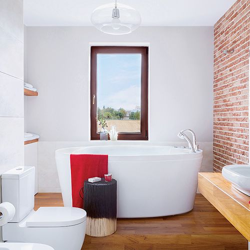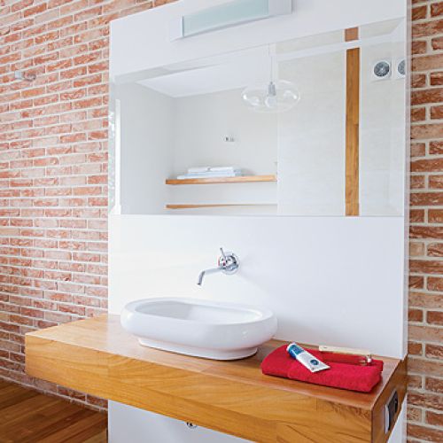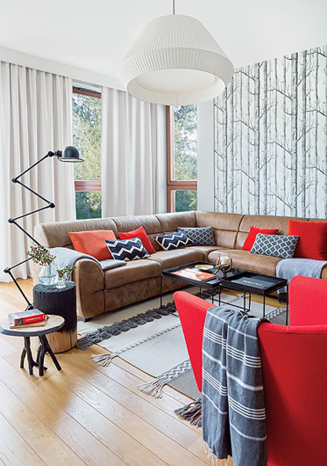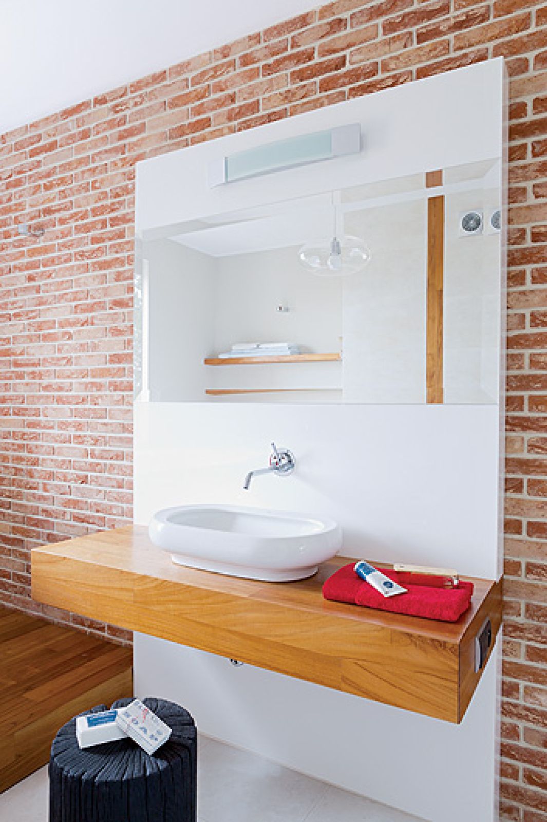 Agata śmieje się, że jej dom to taki soft loft. Stąd szare ściany i fragmenty czerwonego muru, kojarzącego się z pobliskim Krakowem i austro-węgierskimi fortami, których w Galicji jest sporo. Ale w środku dużo też jasnego drewna: olejowane dębowe deski na podłodze, tekowe blaty oraz taki sam podest pod wanną. „Drzewna” jest też tapeta Cole & Son. Jej wzór tak idealnie nawiązuje do tego, co widać za oknem, że Agata wypiaskowała ten sam deseń również na szklanych drzwiach w sypialni. Szorstko-gładka konwencja prowokuje do zmian i „dostawek”.