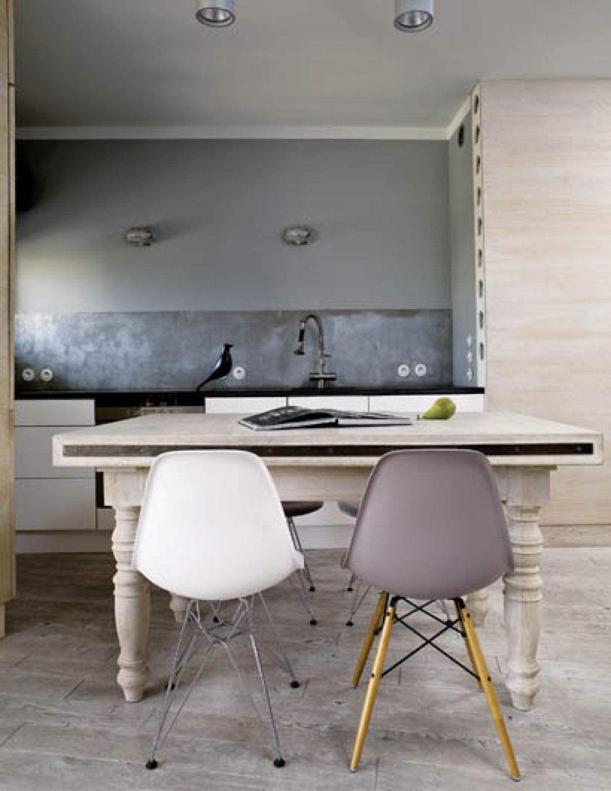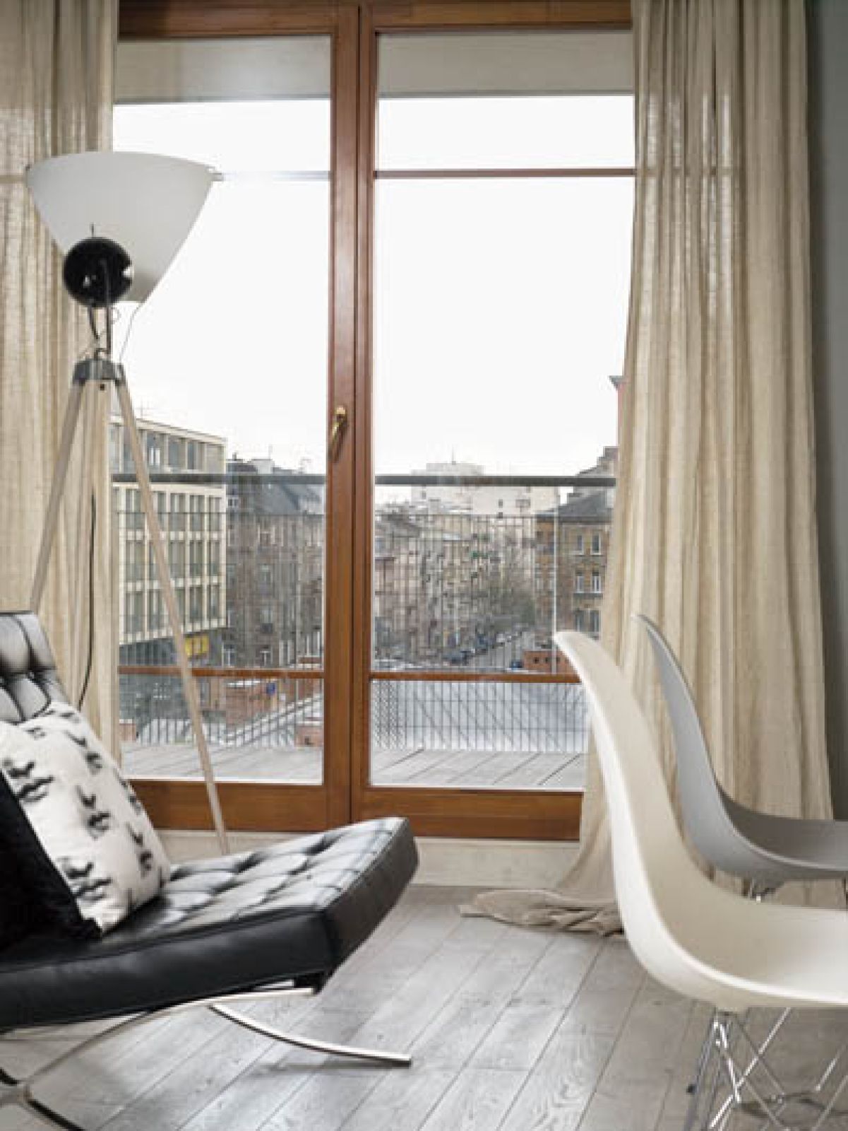 Główne miejsce zajmuje zaprojektowany przez architektkę stół. Ciężki, na toczonych nogach. Z bielonego dębu. I żeby nie był za konwencjonalny, zbyt mieszczański – z metalową listwą (bednarką) dookoła. Za to całkiem konwencjonalnie stół pełni rolę serca domu. Służy do pracy, układania kwiatów i przyjęć (dla dwóch osób lub dwudziestu). Naprzeciwko dwa czarne fotele Barcelona. Mało miejsca do siedzenia, zważywszy imprezowe zapędy gospodarza, ale Michał uznał, że wszystkich i tak nie posadzi, więc nie ma czym sobie głowy zawracać.
