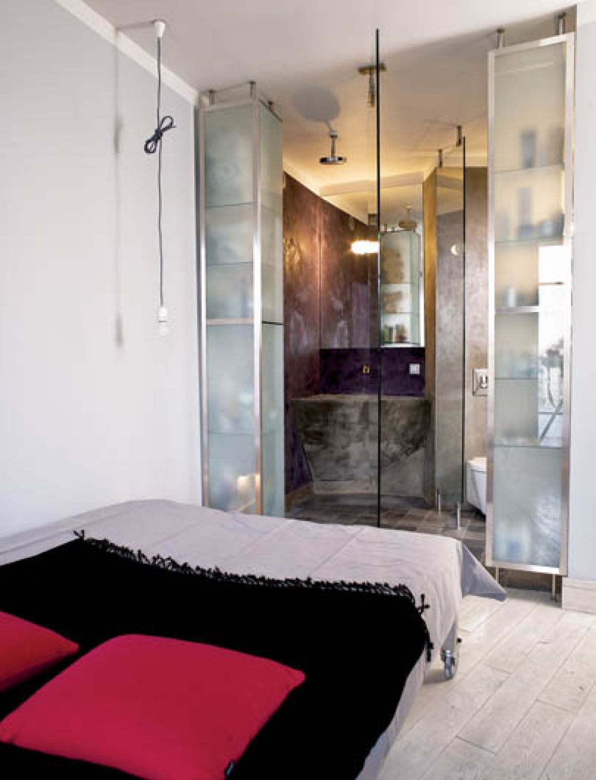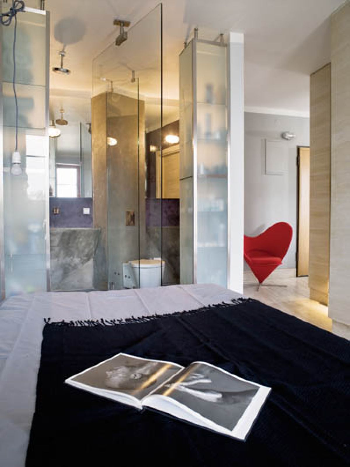 Zaczęli od łazienki. Niekonwencjonalnie: dwa betonowe koryta zamiast umywalek, zwykłe ogrodowe krany i kurki zamiast wypasionych baterii, beton na ścianach i wielka tafla szkła (jednocześnie obrotowe drzwi) oddzielająca prysznic od sypialni. – Nawet jak dla mnie było odważnie. Nie każdy zdecyduje się pokazywać sąsiadom pod prysznicem – opowiada Michał.