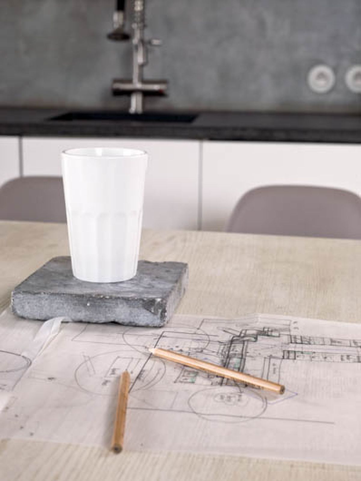 Podobne słupy-szafy stoją w sypialni. A kolejne dwa to rama konstrukcyjna między sypialnią i łazienką. Równie ascetyczny jest aneks kuchenny. Kubiki z białego lakierowanego mdf-u (dobrze odbijającego światło i rozjaśniającego wnętrze), przykryte blatem z czarnego łupka. Nad tym pas betonu.