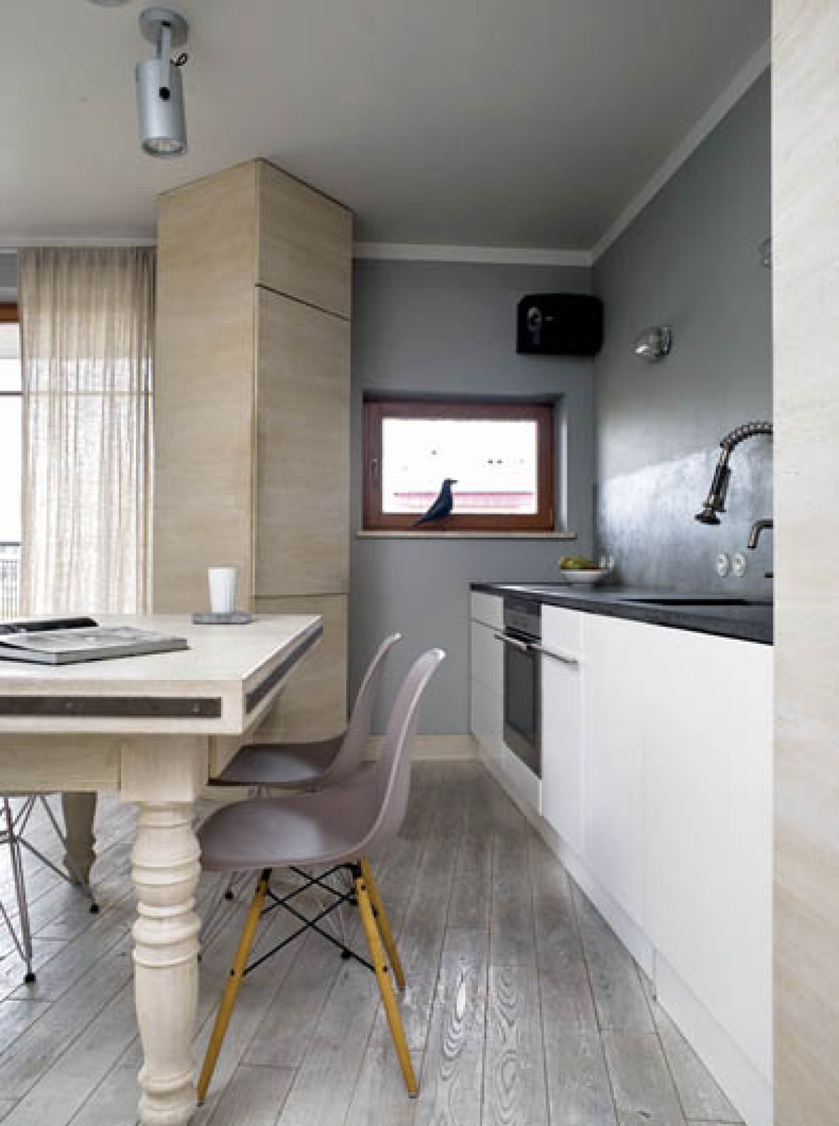 Właściciel nie chciał, by mieszkanie przypominało hotelowy apartament (jeśli dużo się podróżuje, na hotele nie można już patrzeć). Nie przypomina. Jedno tylko nie daje spokoju: czy ktoś tu w ogóle mieszka, skoro nie widać żadnych przedmiotów? Michał nie lubi, by cokolwiek męczyło oko, więc wymyślił z Hanią sprytne schowki. W „pustym” dziennym pokoju ogromną szafę cargo schowali za grafitową ścianą, a dwa obłożone dębowym fornirem słupy ukrywają lodówkę i kolejną szafkę.