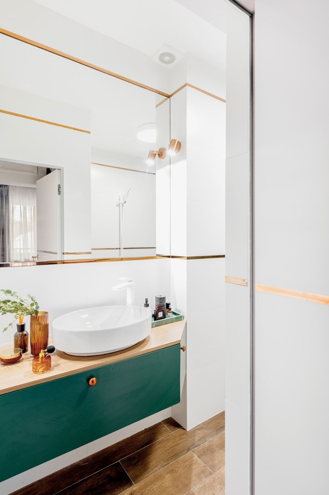 Styl nowoczesnyOstry błękit w kuchni, butelkowa zieleń w salonie i pudrowy róż w sypialni. Wszystko spina miedź połyskująca ciepło w całym mieszkaniu. Oto odważne, lekko szalone mieszkanie Martyny.