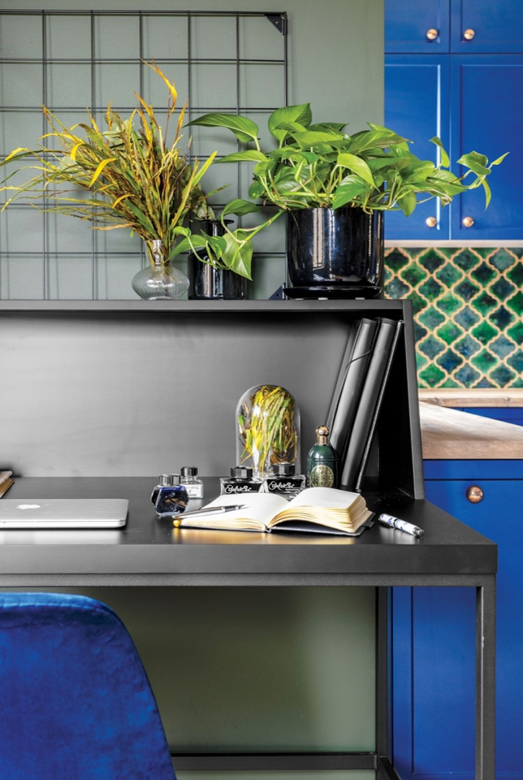 Sama Martyna nie spodziewała się, że kiedykolwiek zdecyduje się na tak nietypowe rozwiązanie. Wybór odcienia nie był łatwy, ale stolarz przyszedł z pomocą i dostarczył wielu próbek. Padło na intensywny błękit z odcieniem metalicznym. Do tego dla kontrastu miedziane uchwyty. – To mój ukochany metal – mówi Martyna. – Mam mnóstwo takiej biżuterii. I znów – coś z babskiego świata mody trafiło do wnętrza. W dodatku jako leitmotiv – bo miedź pojawia się w każdym pomieszczeniu, dzięki czemu spaja kolorystycznie całość. Raz w dodatkach typu lampy czy nóżki krzeseł, innym razem w formie zaskakujących rozwiązań.