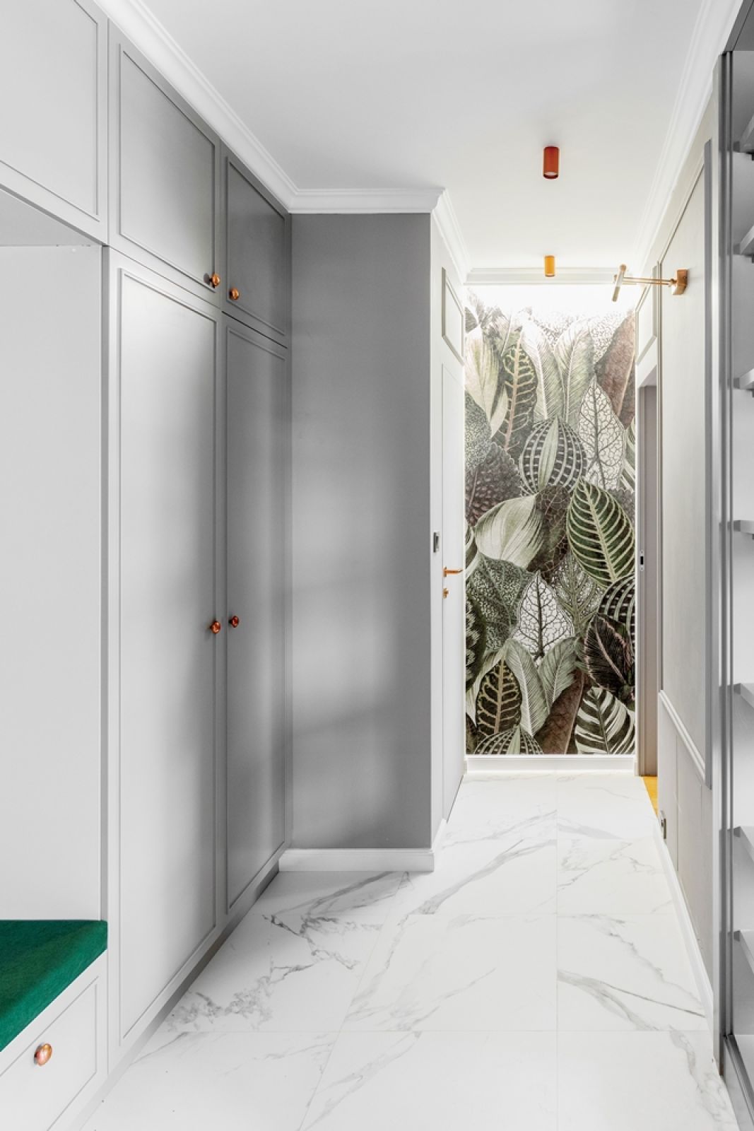 – Obserwuję uważnie moich klientów i widzę, że są już trochę zmęczeni i znudzeni bezbarwnością we wnętrzach – mówi projektantka. Sympatie Martyny najlepiej to ilustrują. Jest odważna, marzyła, żeby wokół niej było dużo koloru. I nie chodziło tylko o akcenty. Miało być mięsiście, barwnie na dużych powierzchniach, z wyrazistymi wzorami. Punktem wyjściowym okazały się tapety z firmy Wonderwall Studio. Krakowska marka drukuje tapety na fizelinie ze specjalną strukturą. Pomaga ukryć na przykład nierówności ścienne, a jednocześnie tworzy ciekawy, intrygujący, przytulny efekt.