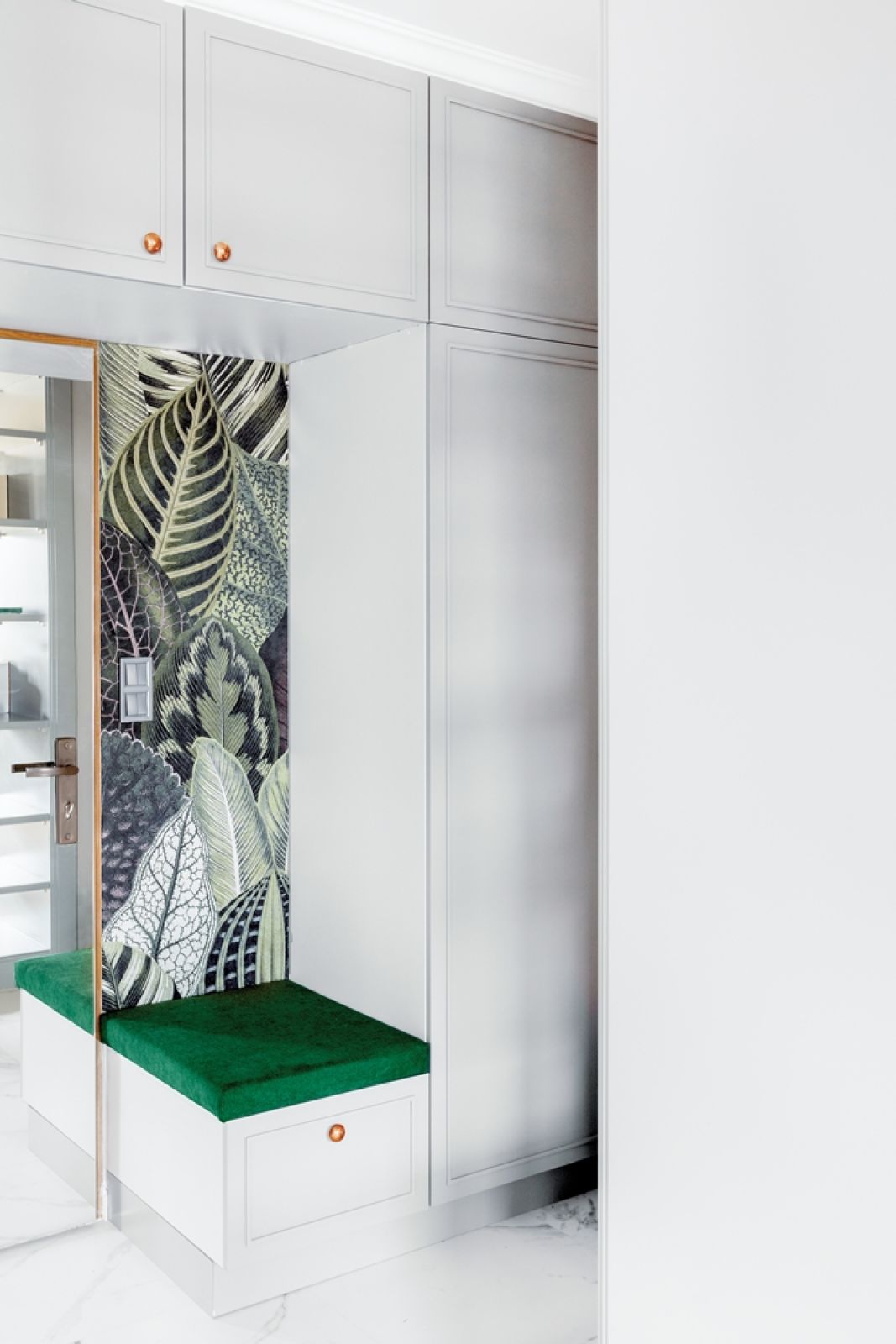 Toaletę przerobiono na garderobę – nawet drzwi do niej zlicowano ze ścianą. Kuchnia została otwarta na salon, a wszystkie jej ściany po sufit zapełniły się kuchenną zabudową. Jednocześnie, żeby kuchnię symbolicznie od salonu oddzielić, powstała kratownica. – Niektórzy wypełniają taką konstrukcję szkłem, my tego nie zrobiłyśmy, bo tu chodzi o symboliczną granicę między pomieszczeniami – tłumaczy Marta. – A przy okazji ten czarny, elegancki element ma stać się w przyszłości kwietnikiem, na którym zawisną donice z ziołami albo oplotą go rośliny. Te ostatnie będą pasowały do zielonego salonu i kwiecistej tapety.