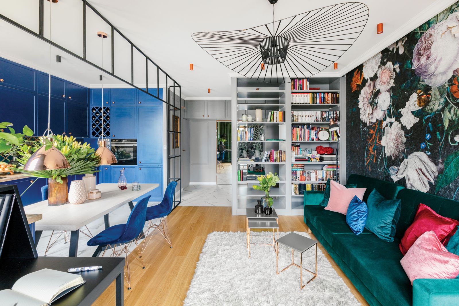 Martyna chciała mieć wielkie kwiaty na ścianach, w których Wonderwall się specjalizuje. Poprosiła tylko Martę o dobranie odpowiednich wzorów do projektu wnętrza. Ta zasugerowała do salonu kwiaty jak z holenderskiej martwej natury na ciemnym tle. Świetnie zgrały się z welurową ciemnoszmaragdową sofą i zasłonami. Akcenty błękitu na tapecie z kolei pasują do koloru szafek w kuchni. Ten jest bodaj najoryginalniejszym elementem wnętrza.