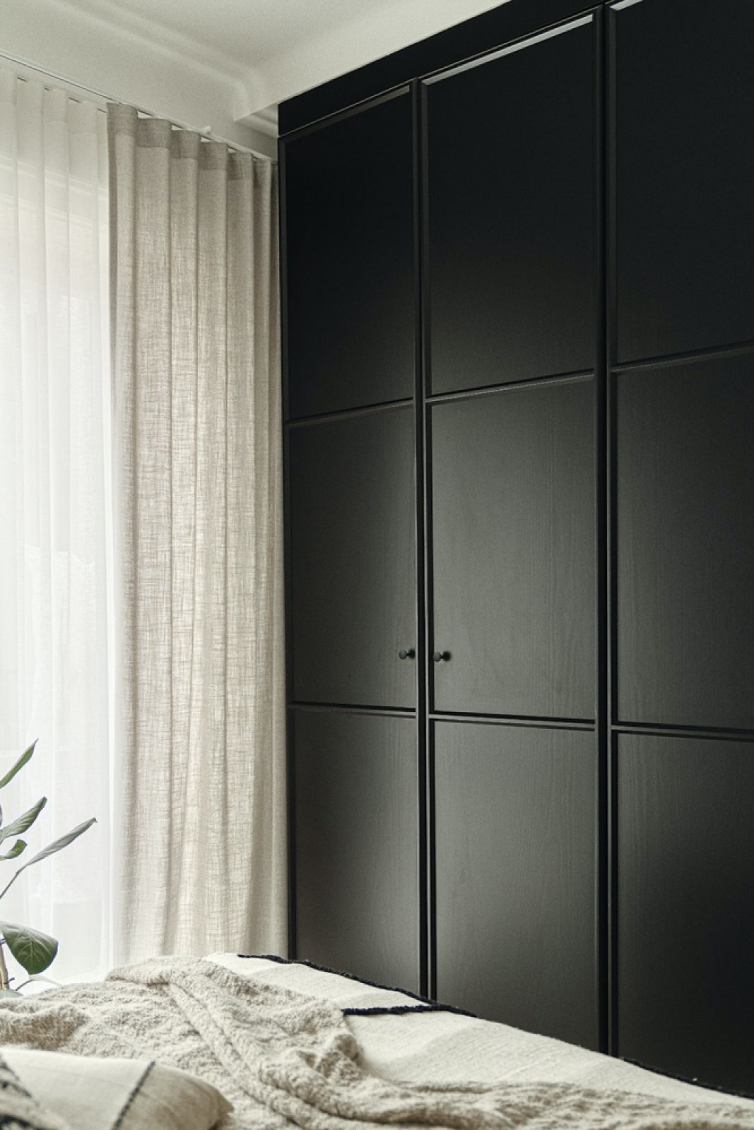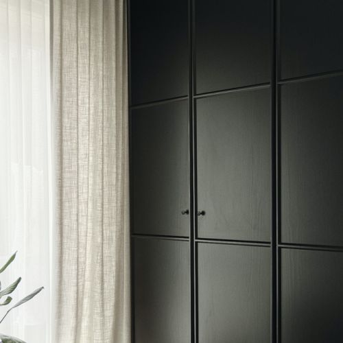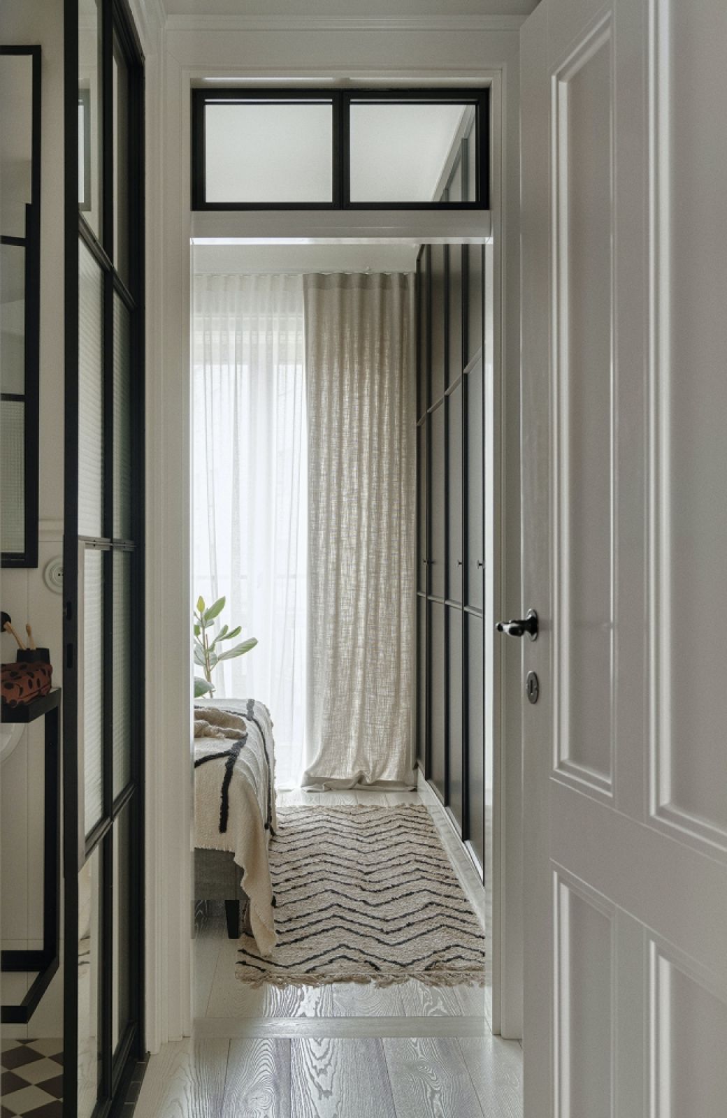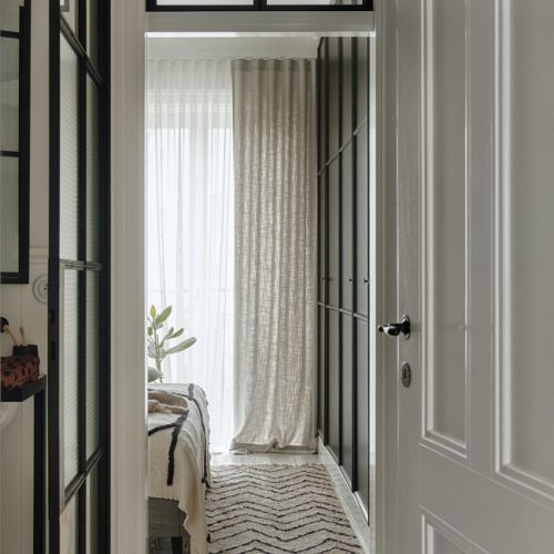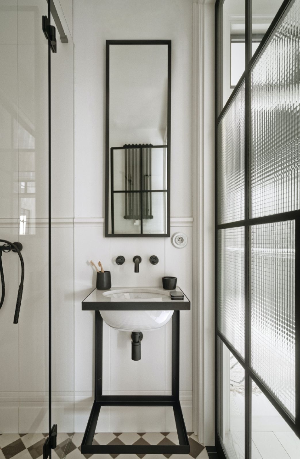 Sam rozkład mieszkania został kompletnie zmieniony. Nie ma już małych pokojów przechodnich. Kuchnia łączy się z jadalnią i salonem, jest gabinet, pokój dzieci, główna sypialnia i pokój gościnny. Szklone, spawane ramy dzielą wnętrze na strefy, na dodatek pomagają doświetlić wnętrze. Jest ono zaaranżowane symetrycznie, choć jak zwraca uwagę architekt, to symetria łagodna i nienachalna. Właściwie wszystkie meble we wnętrzu zostały zaprojektowane przez architekta i zrobione na wymiar przez stolarza.