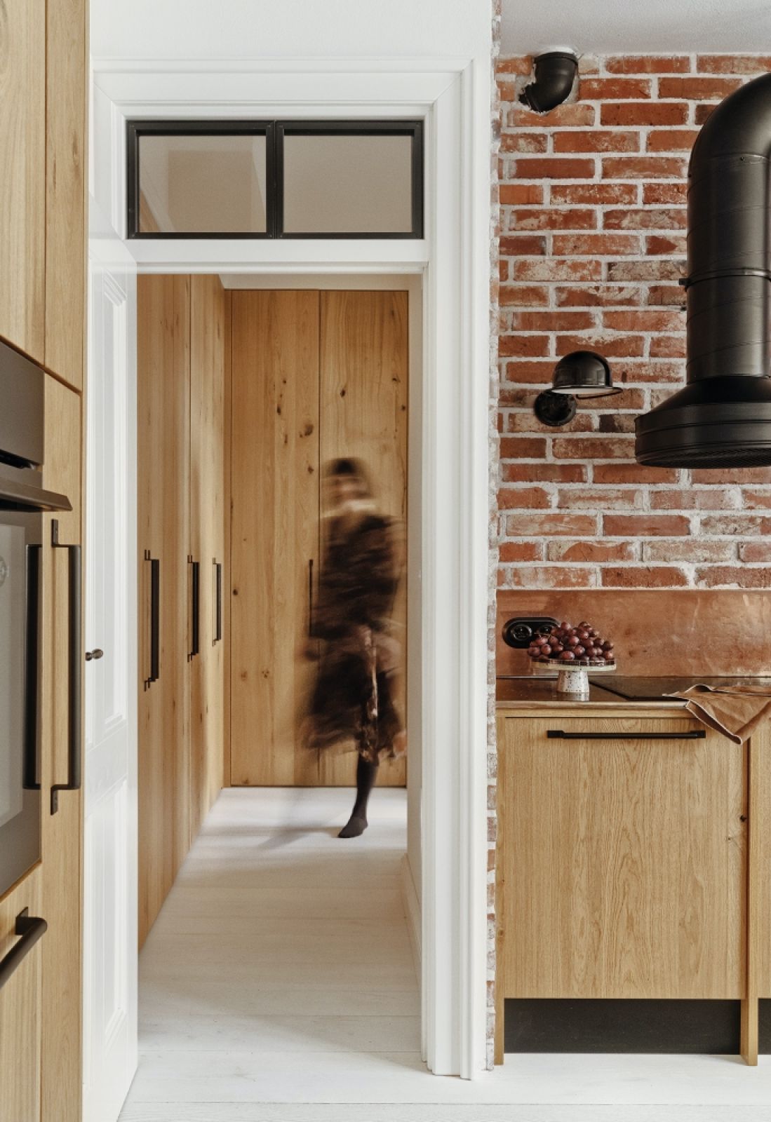 – Przeszliśmy przez trzynaście czy czternaście koncepcji, zanim udało się osiągnąć zamierzony efekt – mówi właściciel. Kluczem są tu drobiazgi i detale, które decydują o klimacie wnętrza. Ściany, choć postawione od nowa, są naśladują stare, przedwojenne budownictwo. Cegła licówka w kuchni wygląda na mocno spracowaną i trochę niedokładnie położoną. Sześciometrowe deski na podłodze mają szpary i gdy się po nich chodzi, lekko się wyginają. Ola ze śmiechem wspomina, że nie dało się ich wnieść do domu przez drzwi, weszły dopiero przez balkon. Chcieli kupić takie ze starego drewna, ale po prostu się nie dało – trzeba było ciąć nowe na zmówienie.