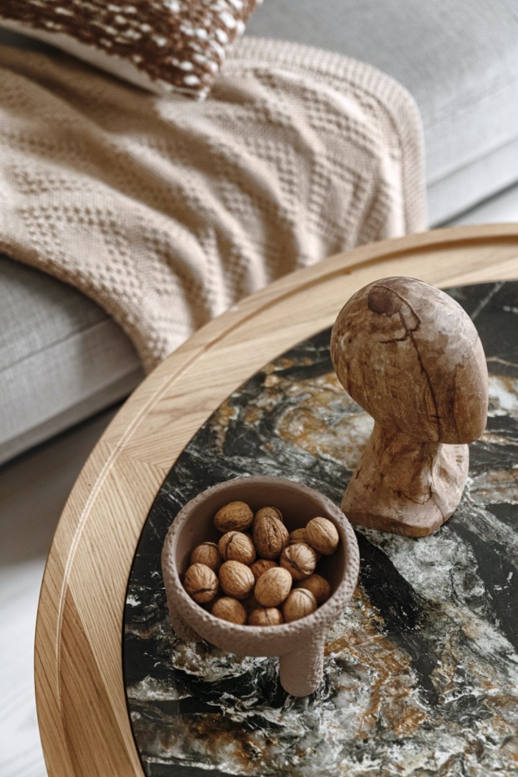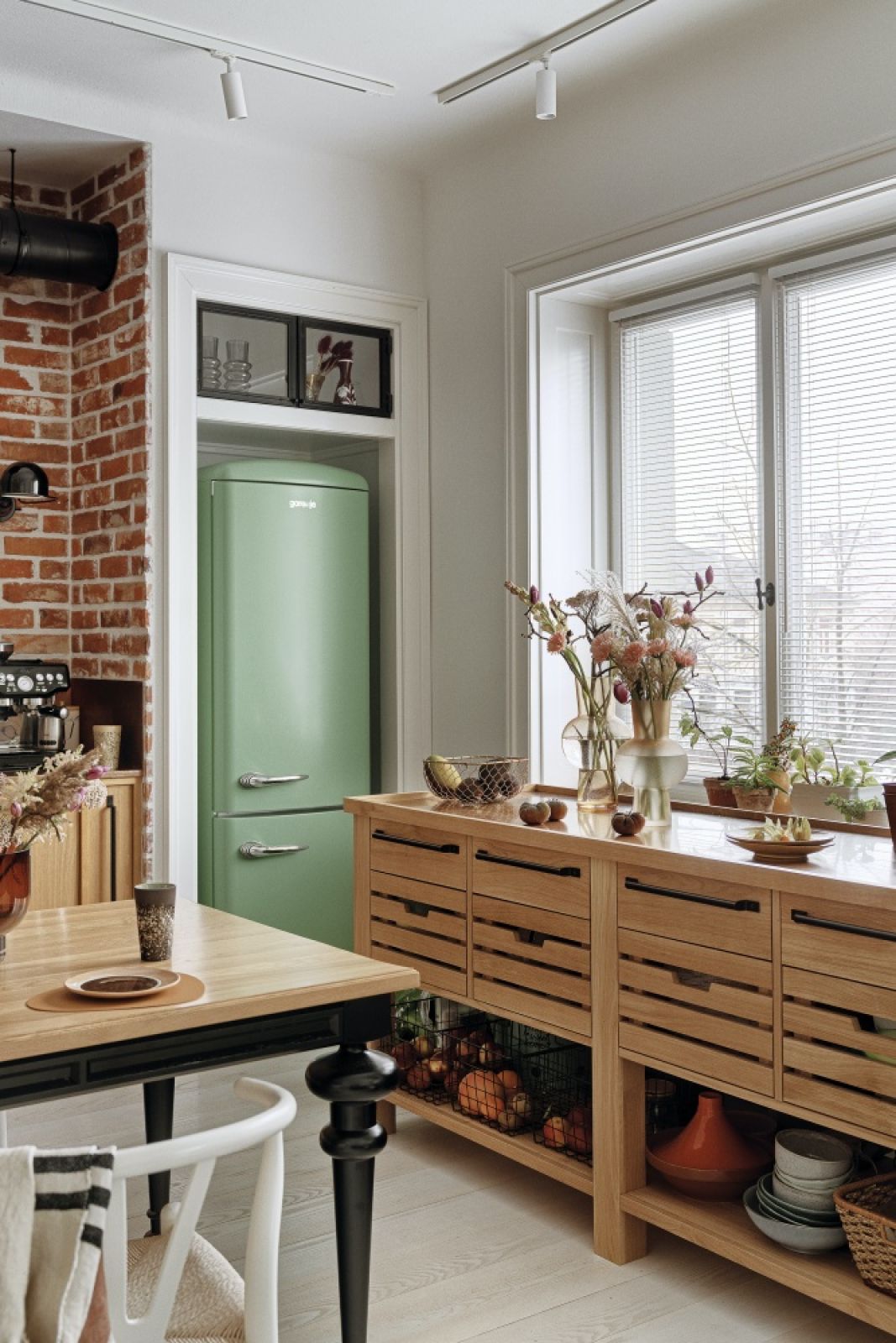 W całym wnętrzu elementy skandynawsko-loftowo-kamieniczne łączą się z sobą w unikalny sposób. – Ja się właściwie nie zastanawiam nad tym, jaki tu jest styl – stwierdza Ola. – Jest to, co my lubimy! I dodaje żartem, że ma, co sobie wymarzyła: miedziany blat w kuchni i wolnostojącą lodówkę. Jakieś minusy? Na razie nie udało się podłączyć żeliwnej kozy w salonie do przewodu kominowego. No i trzeba się przyzwyczaić, że słychać, jak w rurach spływa woda. W końcu to przedwojenna kamienica, a nie nowoczesny loft.