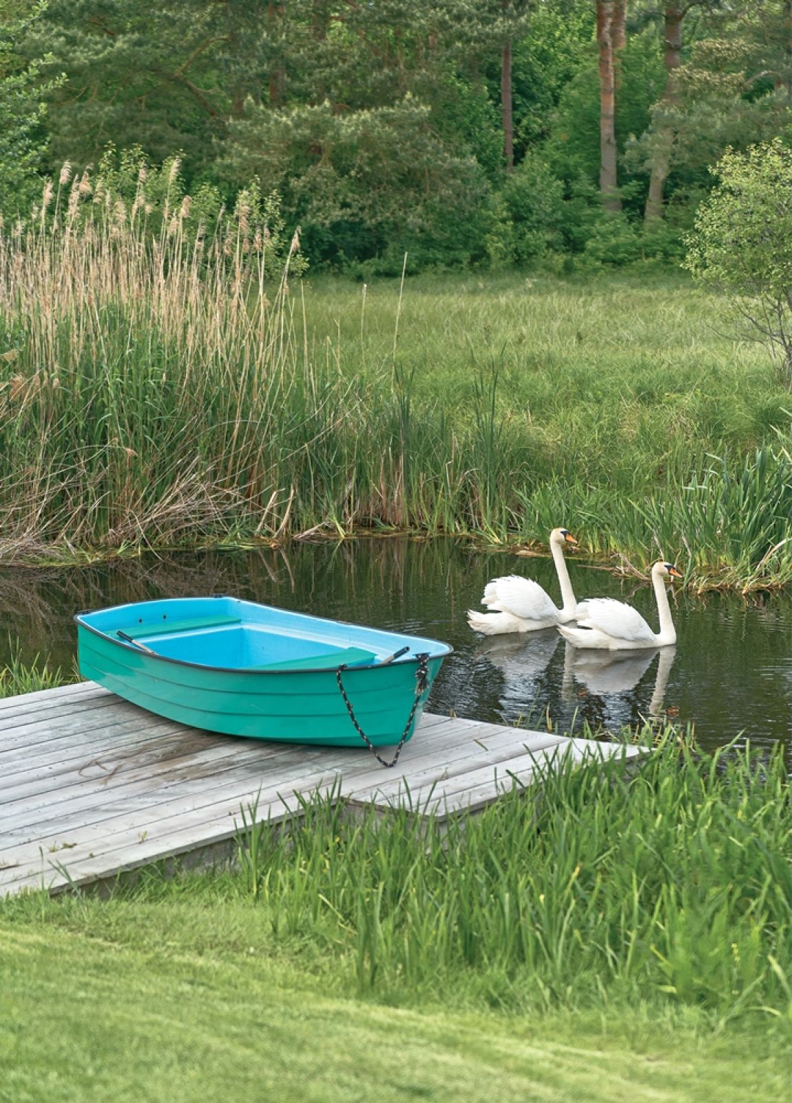 – Duże biblioteczki są też w obu gabinetach, a w sypialni gospodarzy przy łóżkach stanęły podwójne, wsuwane w siebie stoliki, by na lektury było wystarczająco dużo miejsca. – Mieliśmy tutaj dużo czytać, a nawet się dokształcać, ale nasz dom rozleniwia – śmieje się Ewa. – Wracamy, zasiadamy na sofach, leżakach albo w hamaku i cieszymy się przyrodą, która pięknie zmienia się z porami roku. W życiu nie chcielibyśmy znów mieszkać w mieście. Czujemy się tu trochę jak na wiecznych wakacjach. A kto by chciał wracać z wakacji?