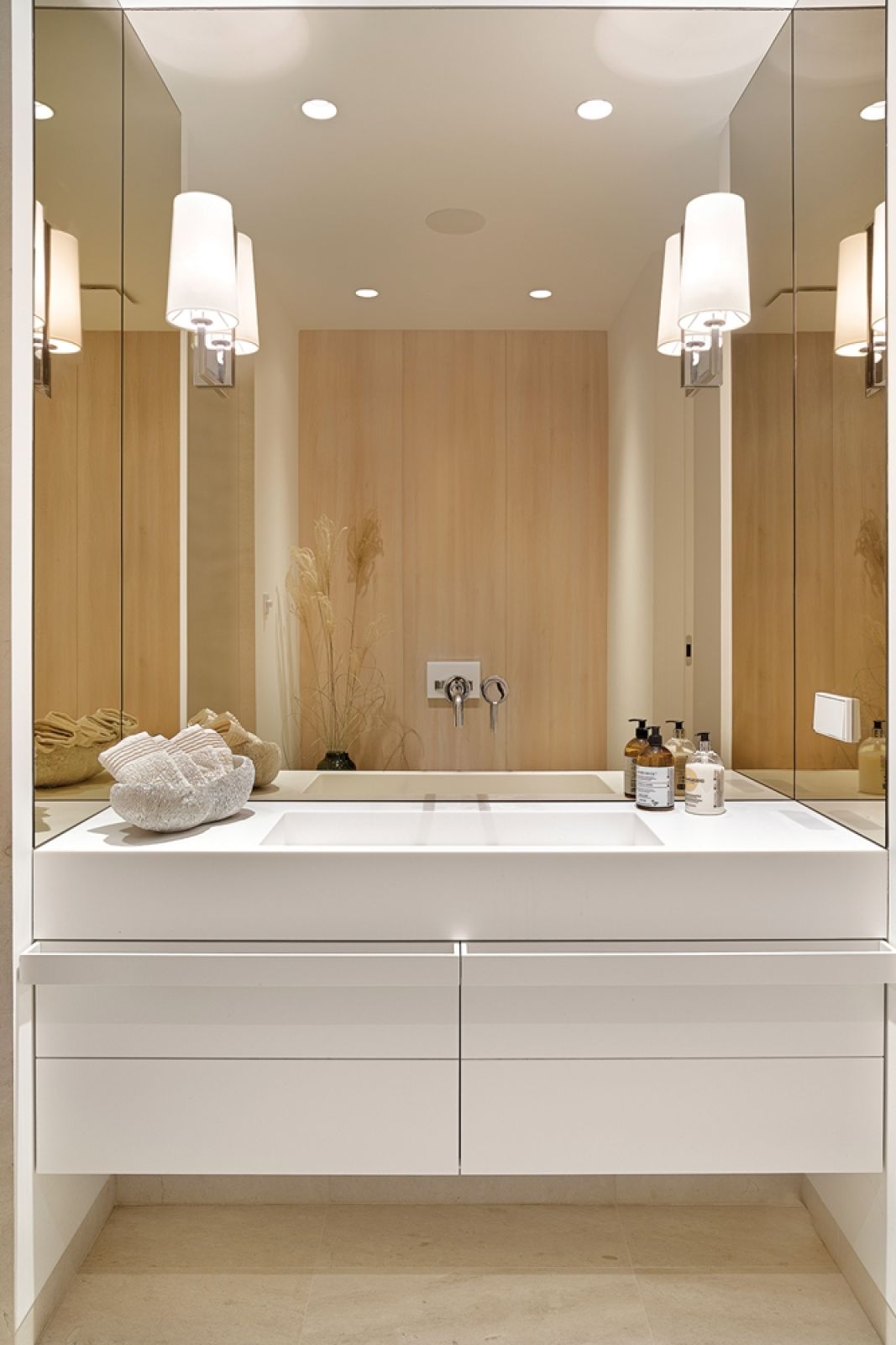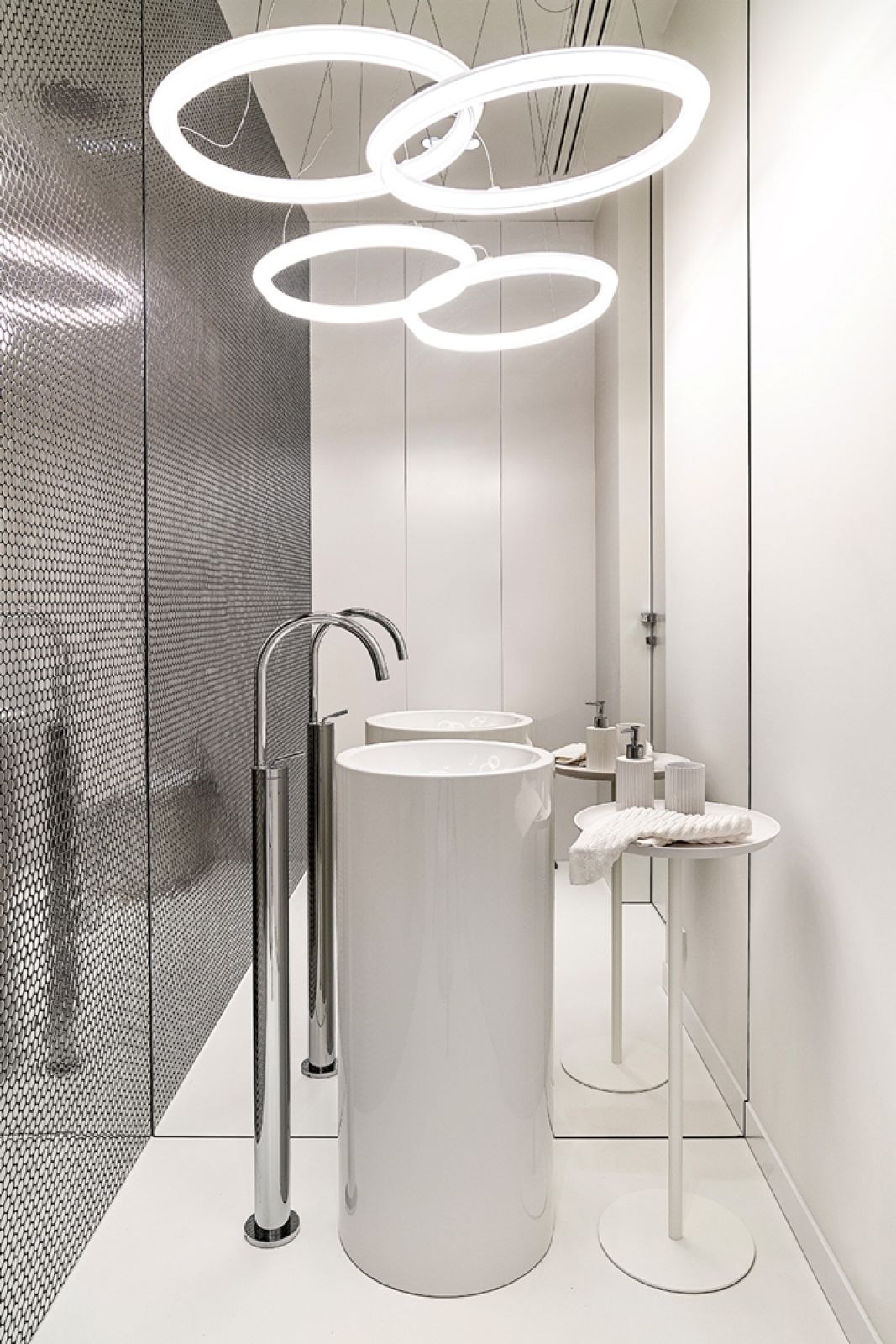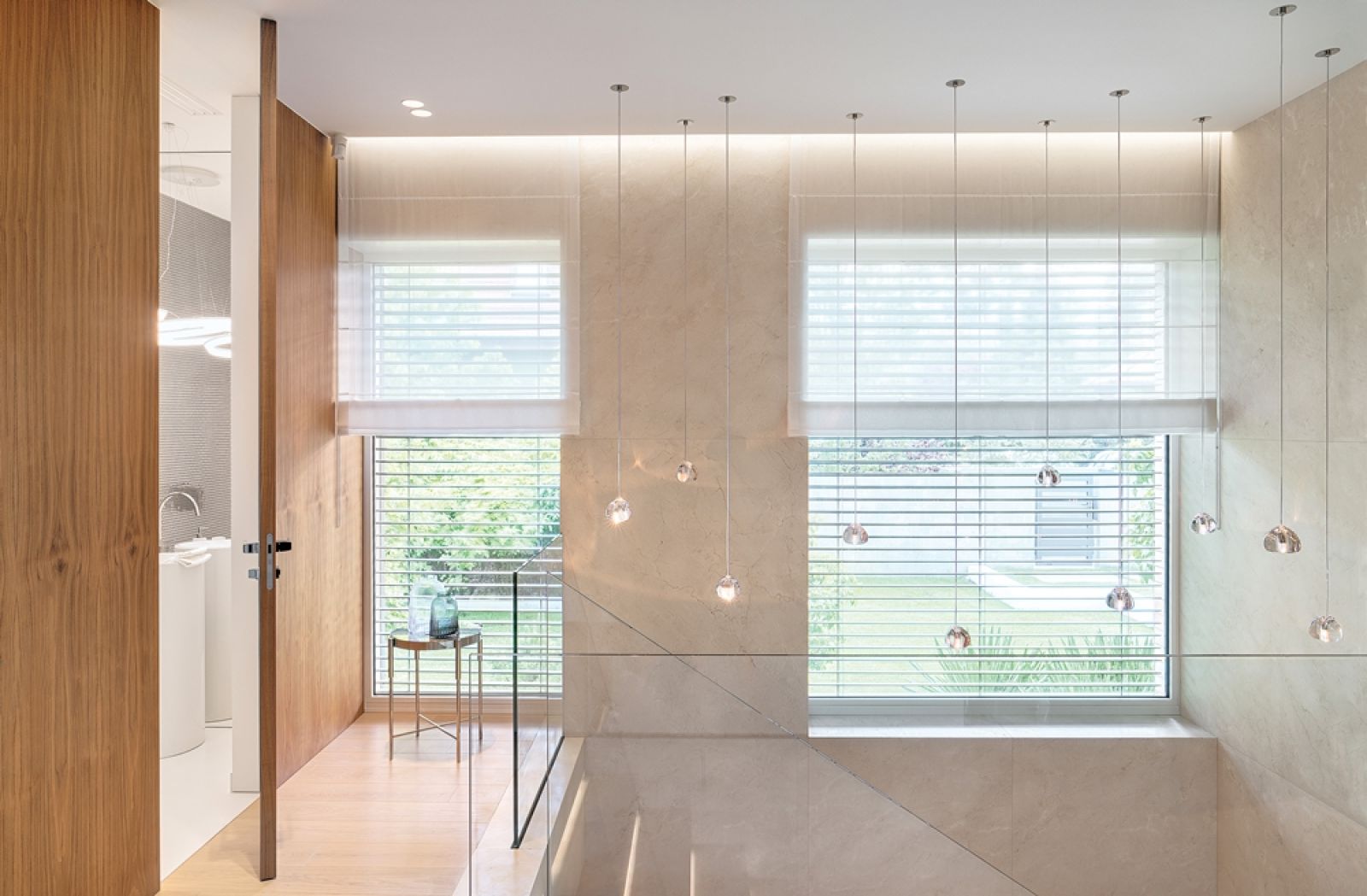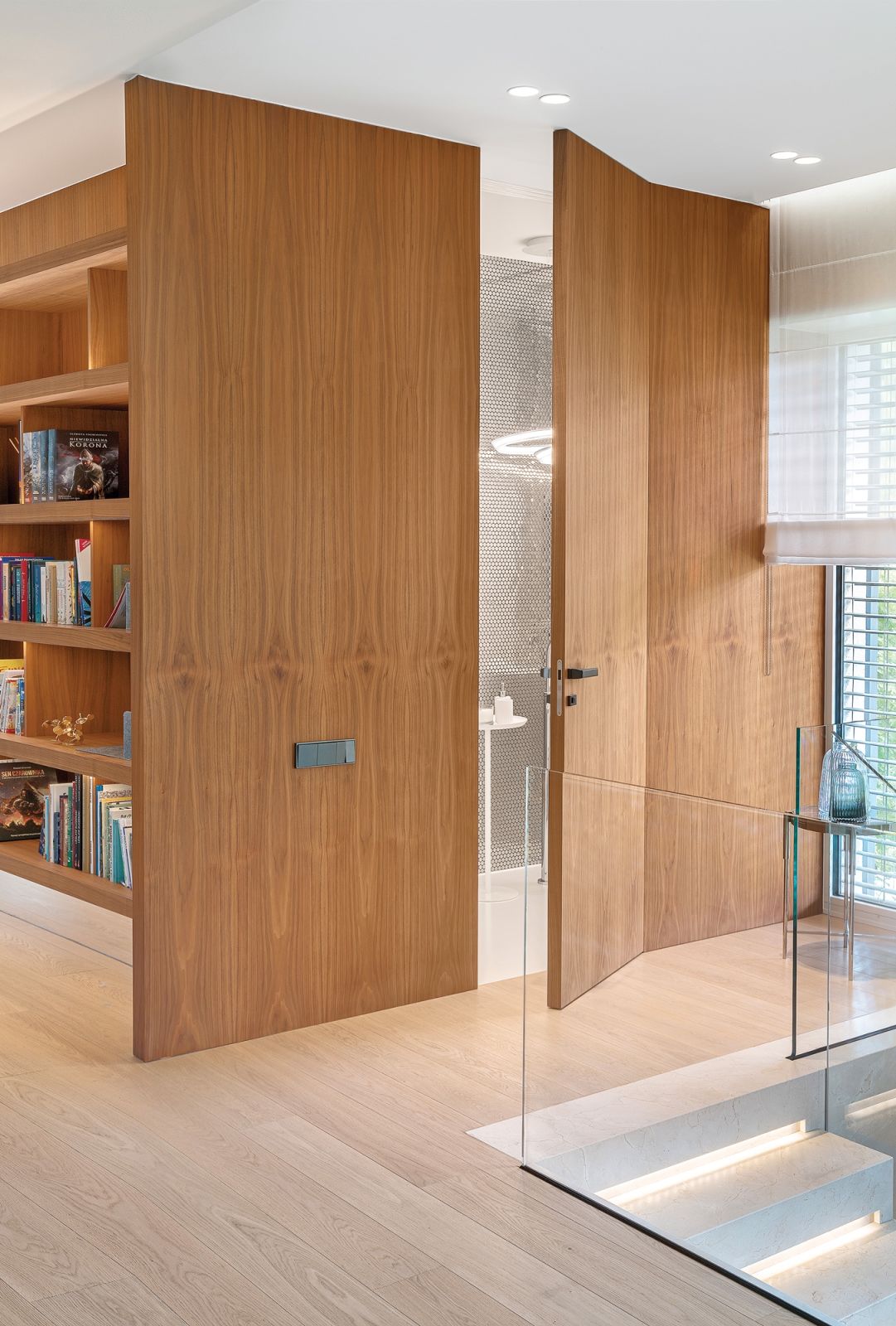 W holu powiesiła lampy jak kostki lodu, które wraz z balustradą ze szkła i podświetlanymi stopniami schodów sprawiają, że można się tu poczuć jak w baśniowej grocie elfów. Łazienka dla gości natomiast ma klimat księżycowy – całą ścianę wyłożono izraelską mozaiką z polerowanej stali, a z sufitu świecą lampy Sfery marki Vibia. Najważniejsze jednak były książki.