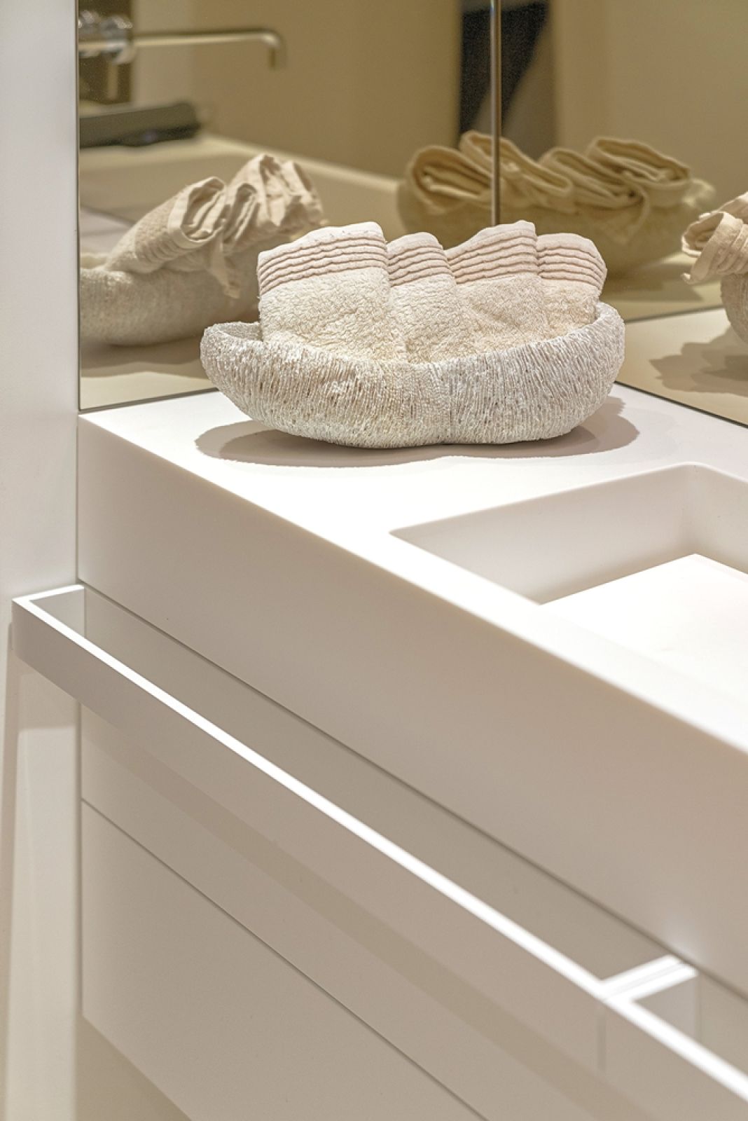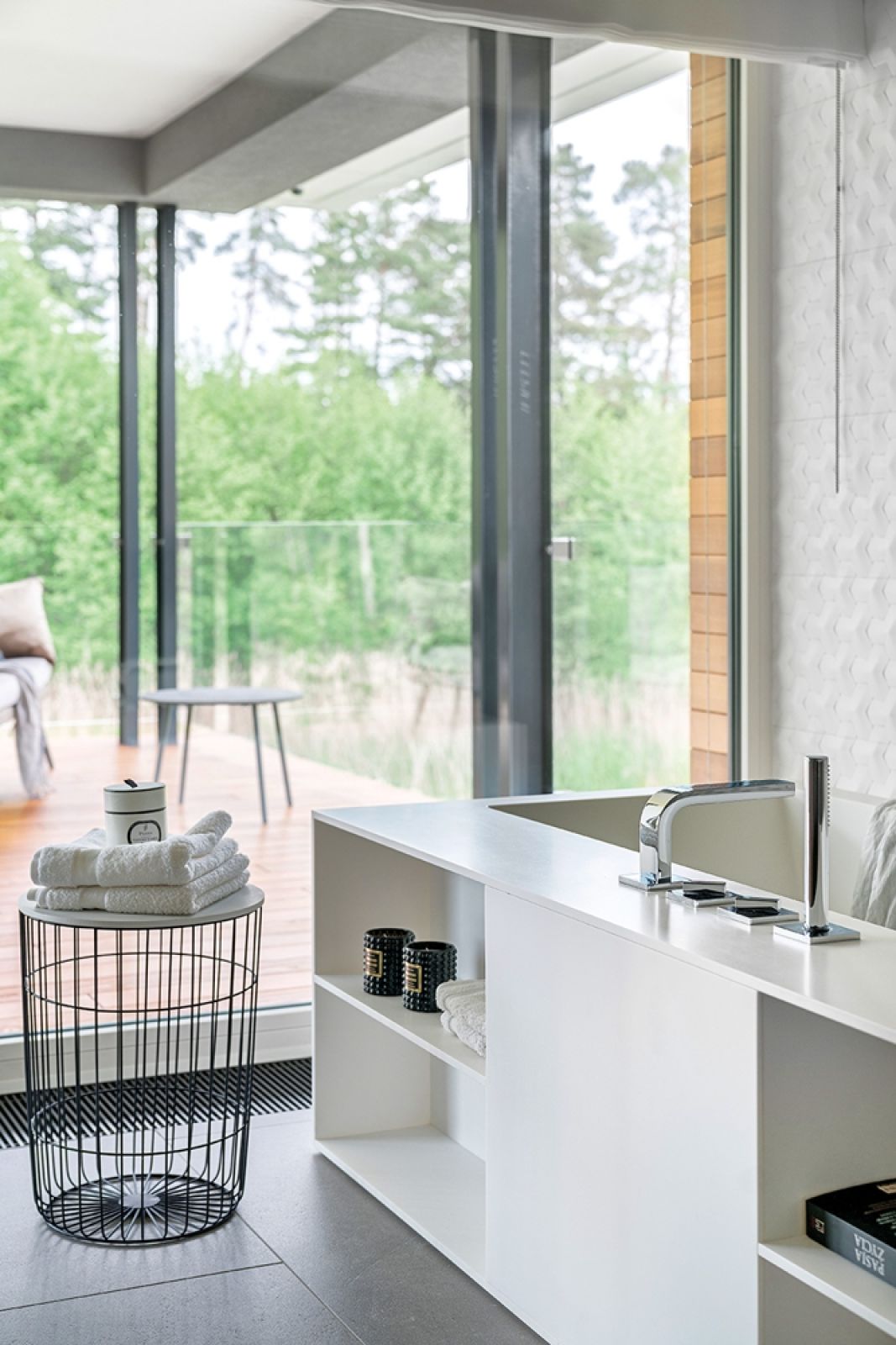 – Klienci kochają je, czytają i namiętnie kolekcjonują – mówi Katarzyna Kraszewska. – Od razu zaznaczyli, że musi się dla nich znaleźć bardzo dużo miejsca, więc zaprosiłam je do różnych pomieszczeń, nawet… do łazienki. Specjalne półki umieściła w obudowie wanny, by leżąc w kąpieli, można było po nie sięgnąć i poczytać przy lampce wina. – Ale przede wszystkim zaprojektowałam w korytarzu wielką ścianę z książek, które witają każdego gościa – mówi.