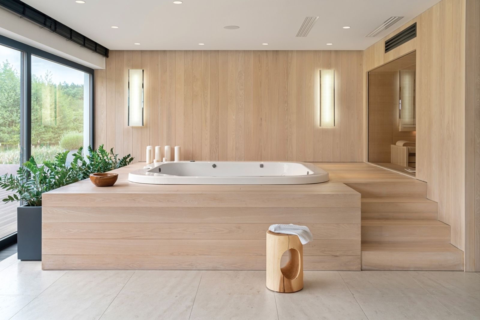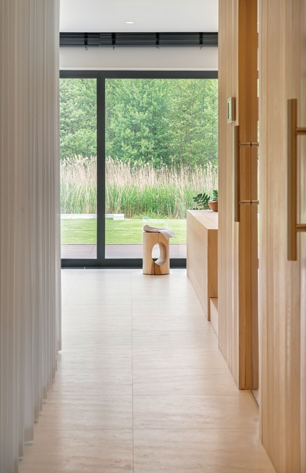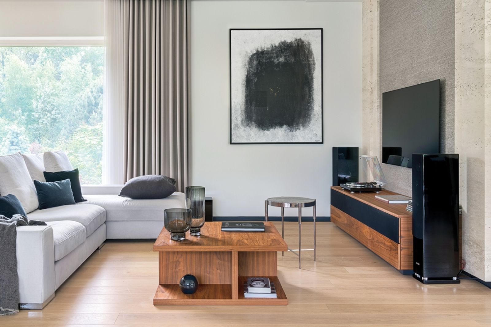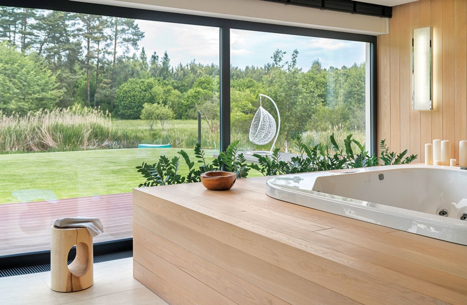 Główna część mieści się na parterze. W holu, dość nietypowo, nie ma schodów w górę, a klatka prowadzi w dół do reszty rezydencji: klubu muzycznego z fortepianem i biblioteką, sali ćwiczeń oraz oszklonego spa z sauną i jacuzzi. Widoki na okolicę są oszałamiające, można stąd także wyjść wprost na taras i do ogrodu, zimą skorzystać z ruskiej bani na zewnątrz albo zejść w dół na pomost, do którego podpływają kaczki oraz łabędzie. Te ostatnie już tak zaprzyjaźniły się z gospodarzami, że gdy tylko Robert podjeżdża i parkuje samochód, pan łabędź od razu płynie się z nim przywitać.