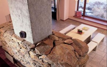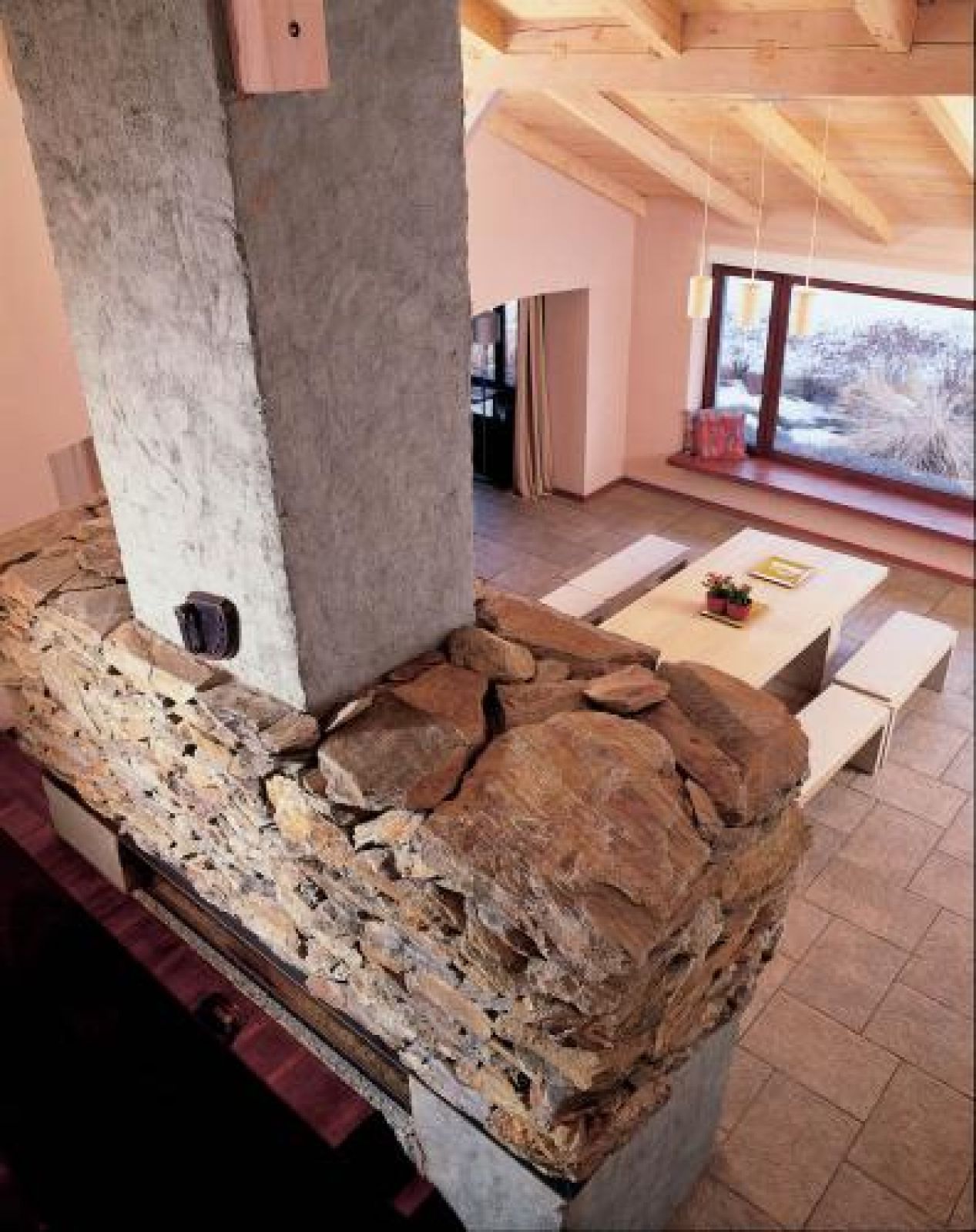 Kominek wymyślił młody architekt Maciej Cierniewski, a wyrzeźbił Grzegorz Kwapisewicz z Centrum Rzeźby Polskiej w Orońsku. Kamień jest też na podłodze i w ogrodzie – pomiędzy kępami traw i lawendy leżą potężne głazy. To właśnie chropowatość kamienia, nierówna faktura tynków i wyraźny rysunek słojów drewna sprawiają, że wnętrze, choć nowoczesne, ma duszę.